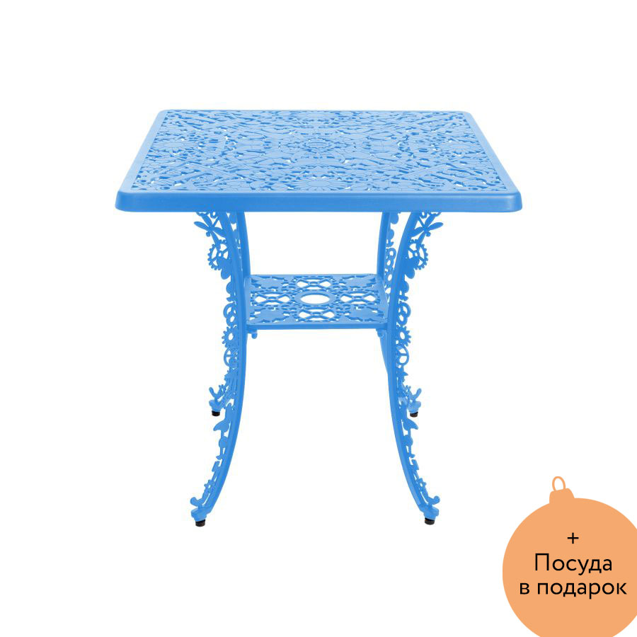 Стол Seletti Industry Collection Aluminium Square Table Sky Blue, синего цвета из литого алюминия. Романтические и неподвластные времени формы классической викторианской садовой мебели. Максимальное представление стиля Pop, разработанного Студией Job. Более классическая садовая мебель теперь модная и яркая, настоящее дизайнерское произведение искусства.