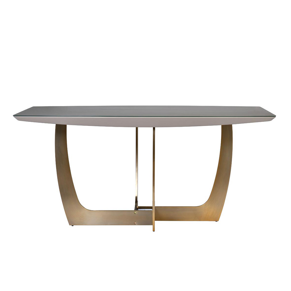 Суперсовременный обеденный стол из мебельной коллекции Space от ведущего бельгийского дизайнера Тома Де Вульфа воплощает последние тенденции европейской интерьерной моды. Столешница из серого МДФ покрыта закаленным 5мм стеклом, обработанным по уникальной технологии, в результате которой поверхность приобретает гладкую и бархатистую фактуру, будто обкатанную морем. Оригинальная фигурная опора медного цвета заменяет традиционные ножки, обеспечивая устойчивость и безопасность конструкции. Все части стола выполнены из исключительно качественных материалов по самым современным технологиям