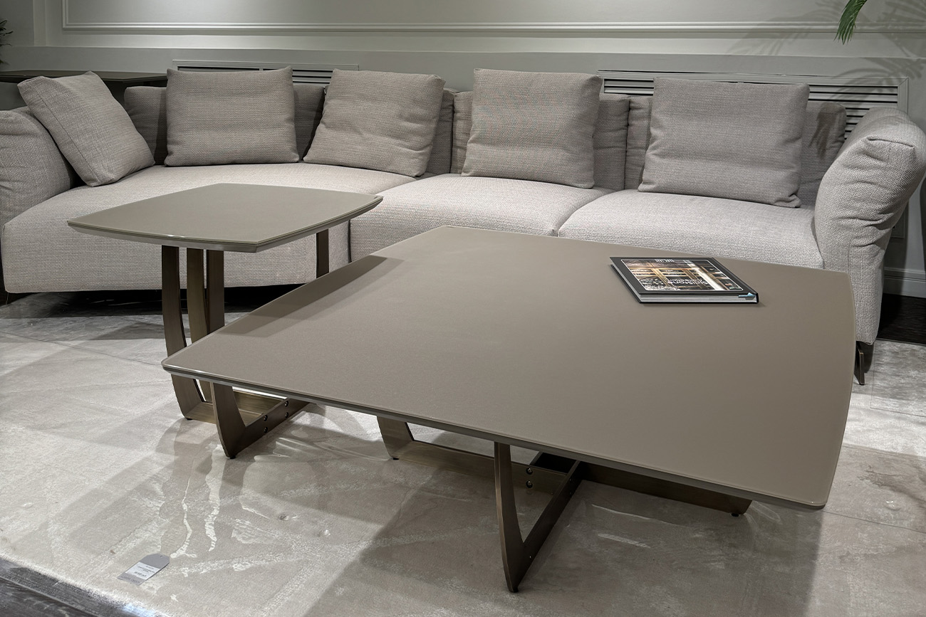 58DB-ET14803 Стол журнальный Space 60*60*55см. Материал: МДФ, сверху столешница покрыта 5мм серым матовым стеклом, основание - металл, цвет желтая медь матов.