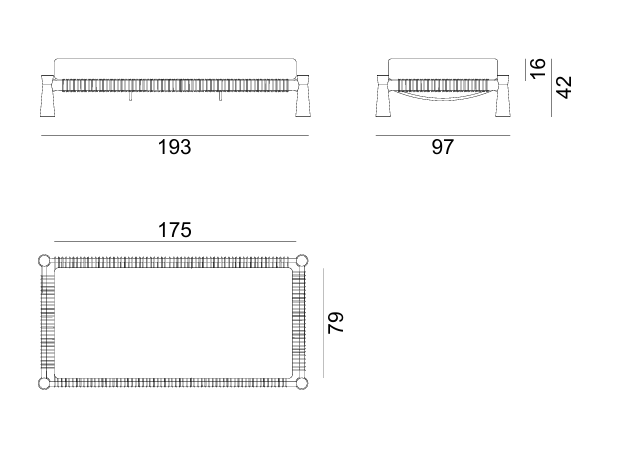 Каркас из африканского тика ироко, обработанного специальным лаком, держит упругое, сплетенное вручную из морских канатов прочное основание. Матрас со съемным чехлом выполнен из термо- и влагостойкого текстиля и наполнителя, предназначенных для уличной эксплуатации.