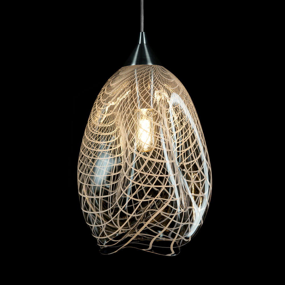 Светильник TULIP White Net напоминает перевёрнутый бутон тюльпана, у которого словно воедино слились лепестки. Каждый плафон уникален, а его средний размер составляет 35X20 см. Фурнитура из сатинированной нержавеющей стали. Так же любой светильник доступен в одной из двух базовых комплектаций на выбор: сатинированная нержавеющая сталь и прозрачный провод или сатинированная латунь и черный текстильный провод. Длина троса от 150см до 5м, дополнительные цвета обмотки : белая, красная, шоколадная, золотисто-желтая, серебристо-серая (Стоимость светильника с проводом 4-5м и дополнительными цветами уточняется).