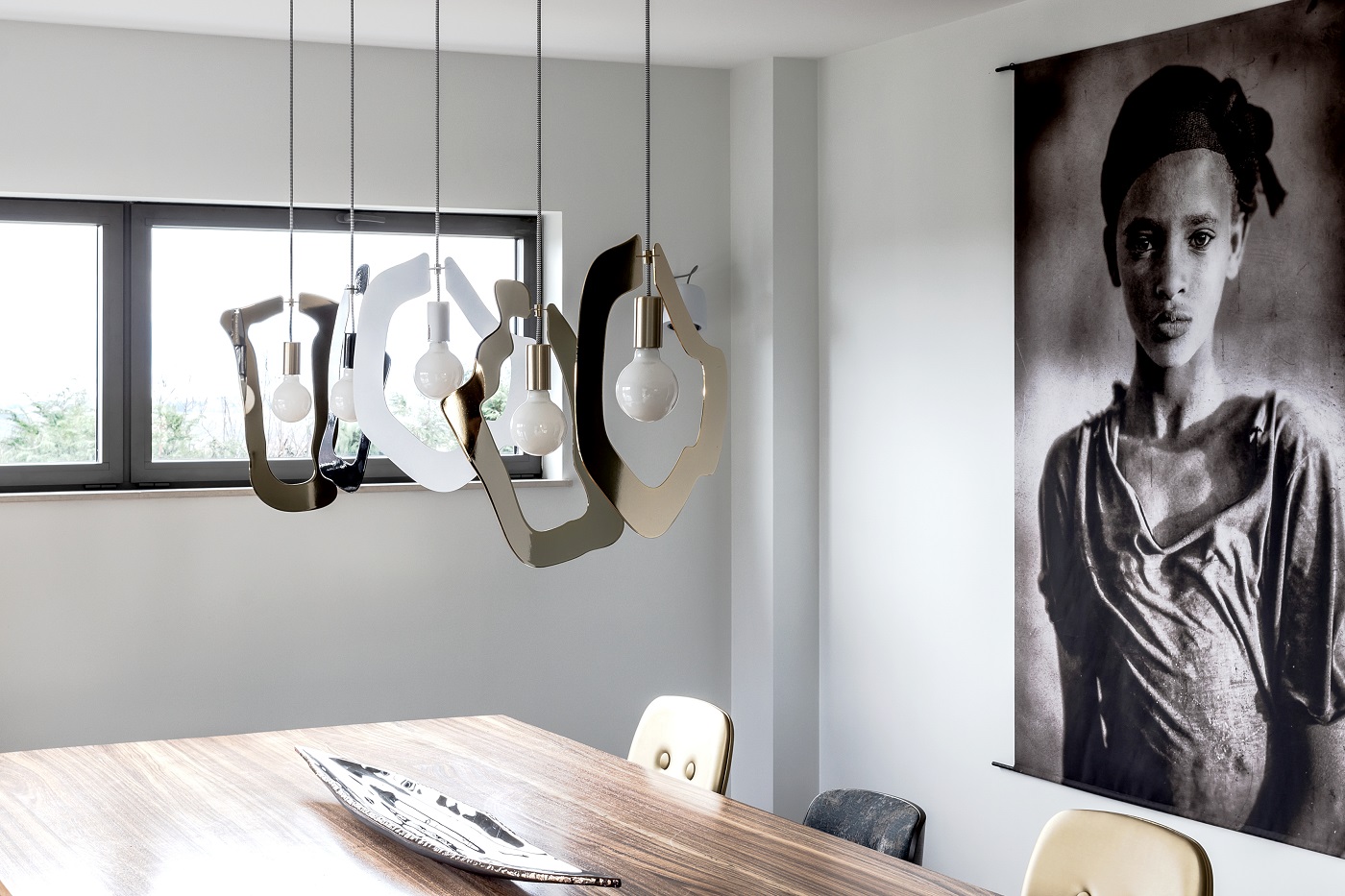 Эти подвесные светильники, словно драгоценности, парящие в воздухе, улавливают свет с изысканной элегантностью. Металл сияет золотом, глубоким чёрным хромом или неподвластной времени бронзой. Плавно паря, они излучают мягкое сияние, сочетая роскошь и таинственность, словно драгоценные камни, подвешенные в ночном небе.