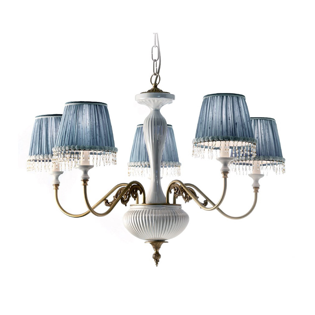 5-рожковая люстра из серии Pearl в классическом стиле ручной работы. Люстра выполнена с основанием из керамики белого цвета, рожки - из латуни, с отделкой состаренное золото. Абажуры устанавливаются на керамических основаниях в виде подсвечников. Плиссированные абажуры из синего шелка украшены прозрачными подвесками из муранского стекла. Люстра крепится на металлическом подвесе, высота регулируется за счет звеньев цепи. Степень защиты IP 20.