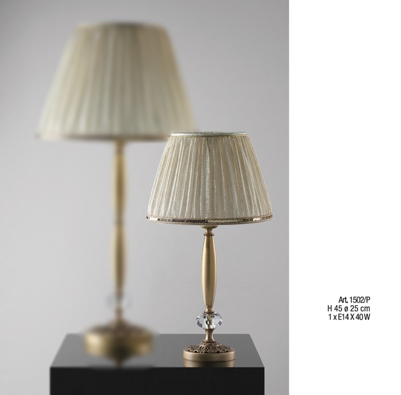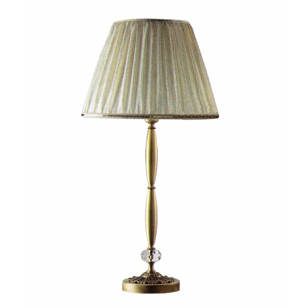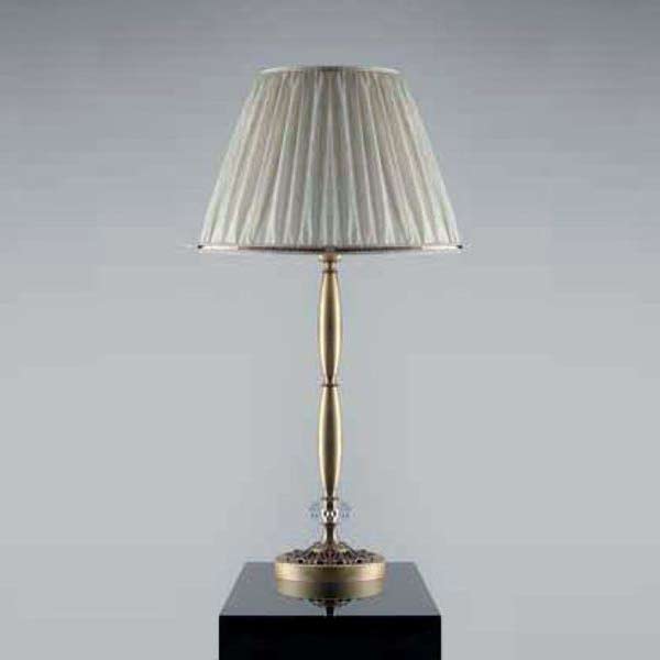 Настольная лампа из серии Shine ручной работы в утонченном классическом стиле со стильным орнаментом. Светильник на каркасе из латуни, с отделкой состаренное золото , декорирован прозрачным хрусталем. Шелковый плиссированный абажур, с окантовкой золотистого цвета. Степень защиты IP 20.<br />