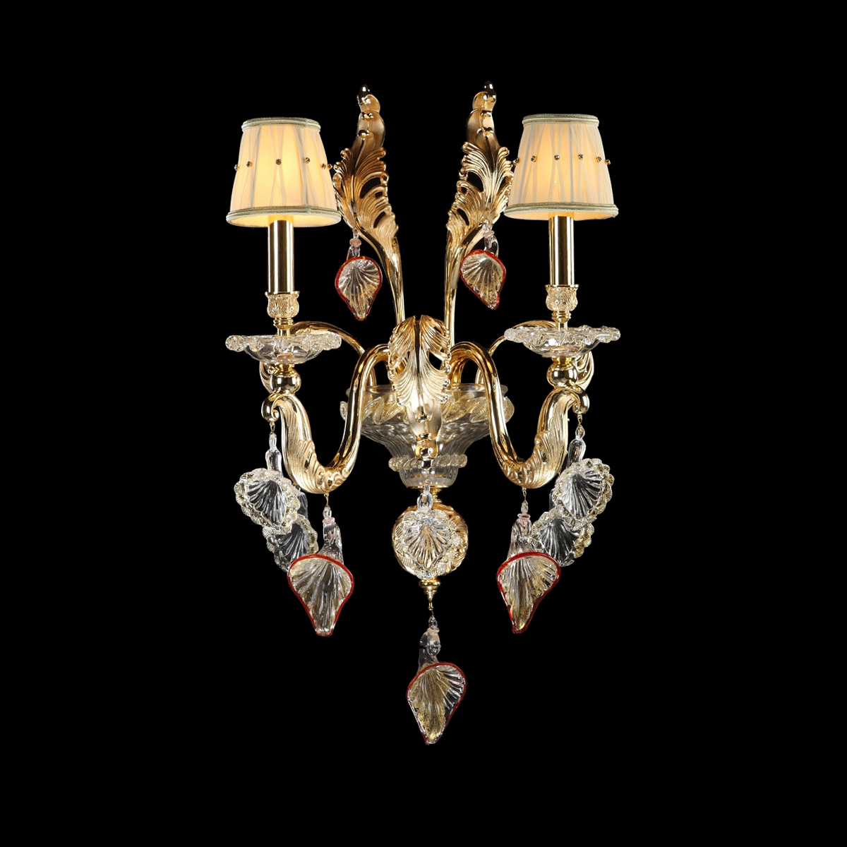Бра из коллекции Anzora с арматурой, декорированной под матовое золото. Прозрачные подвески из муранского стекла. Текстильные непрозрачные абажуры приглушают свет ламп, направляя его на кристаллы подвесок.