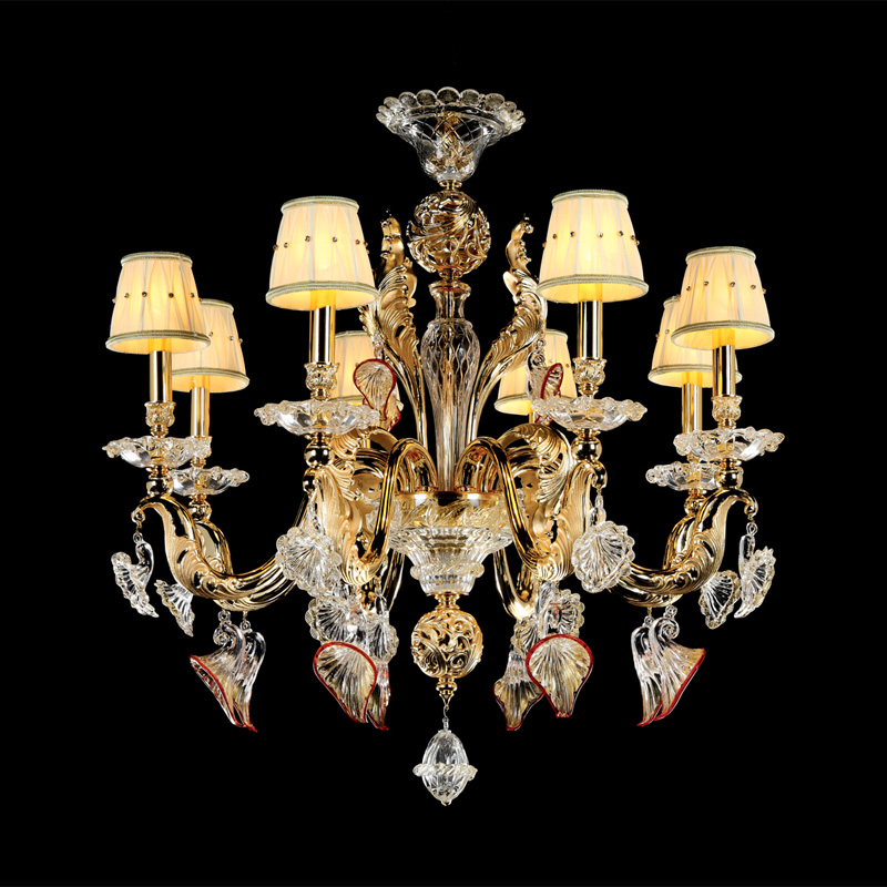 Люстра из коллекции Anzora с хромированной арматурой цвета матового золота и прозрачными подвесками из муранского стекла. Светлые текстильные абажуры приглушают свет ламп, что привносит в интерьер гостиных или парадных холлов роскошь и романтику.