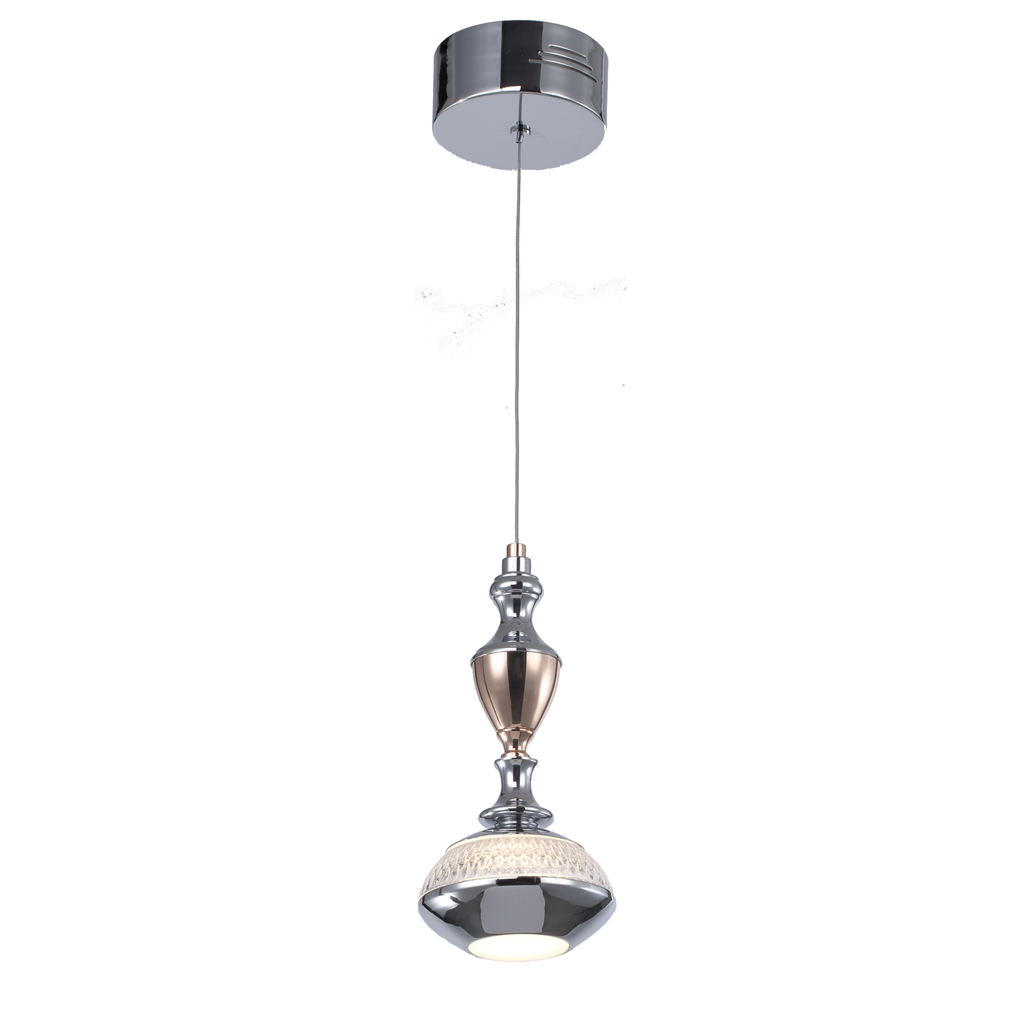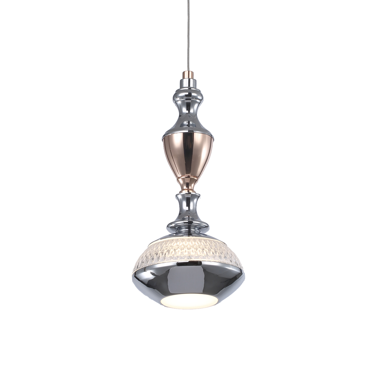 Подвесной светильник из хромированного металла с медными деталями и вставкой из прозрачного стекла.
