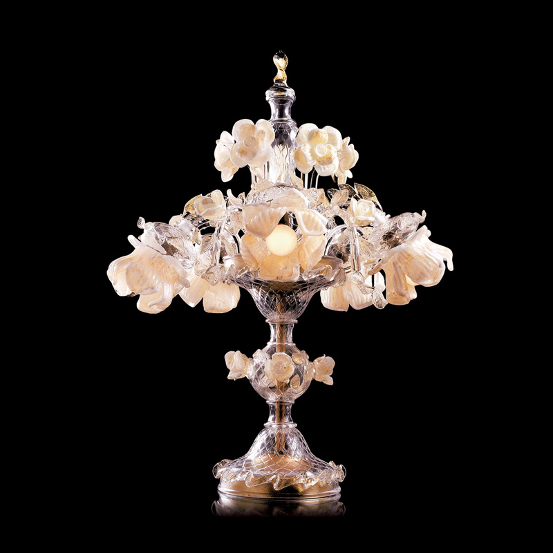 Настольная лампа из коллекции Lupina выполнена в стиле флористики. Арматура золотая, плафоны в виде распустившихся бутонов, выполнены из белого муранского стекла.