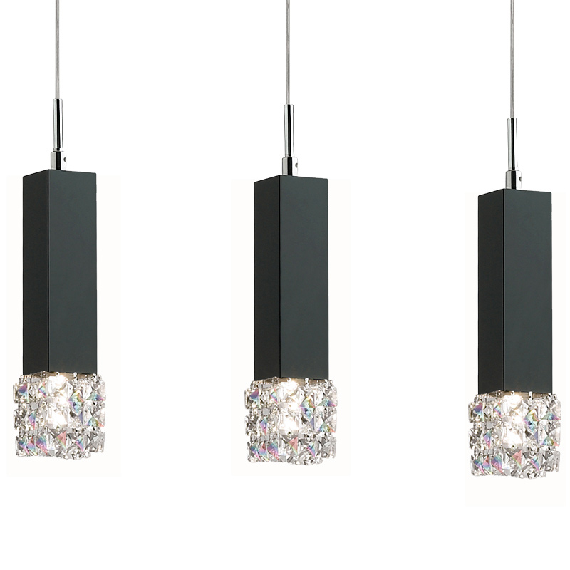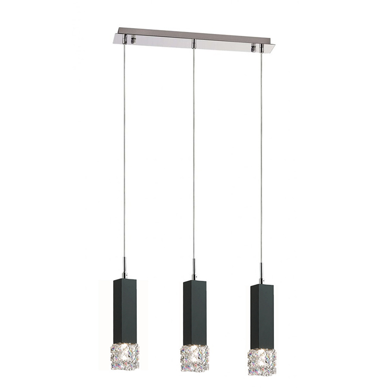 Подвесной светильник с тремя плафонами на хромированной арматуре. Плафоны выполнены из металла черного цвета с прозрачными хрустальными подвесками. Высота светильника регулируется до 120 см.