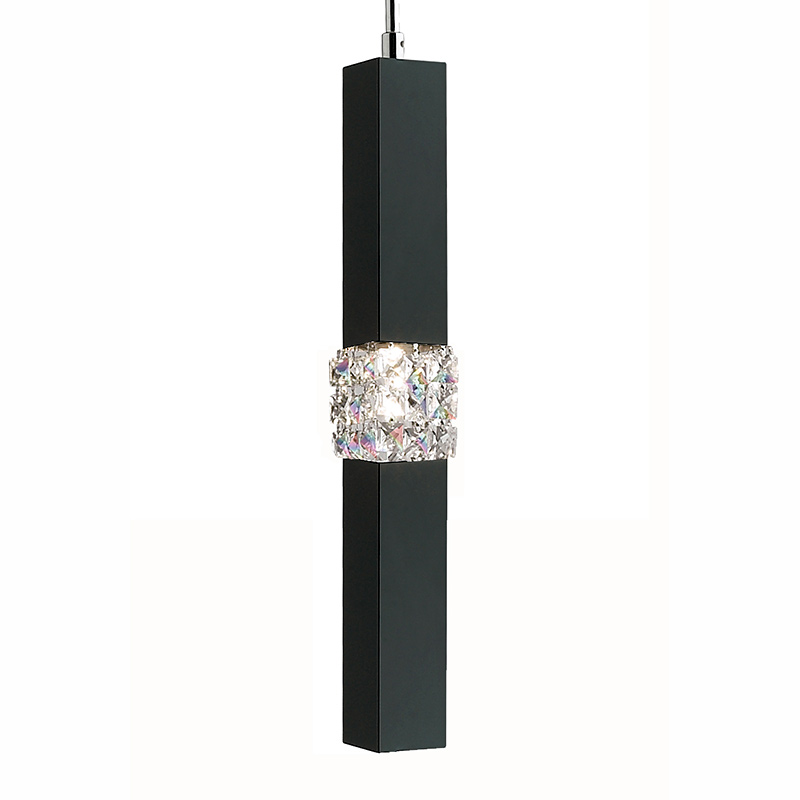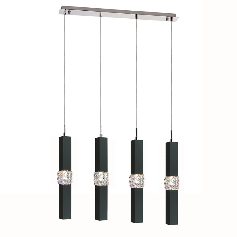 Подвесной светильник с четырьмя плафонами на хромированной арматуре. Плафоны выполнены из металла черного цвета с прозрачными хрустальными подвесками. Высота светильника регулируется до 120 см.
