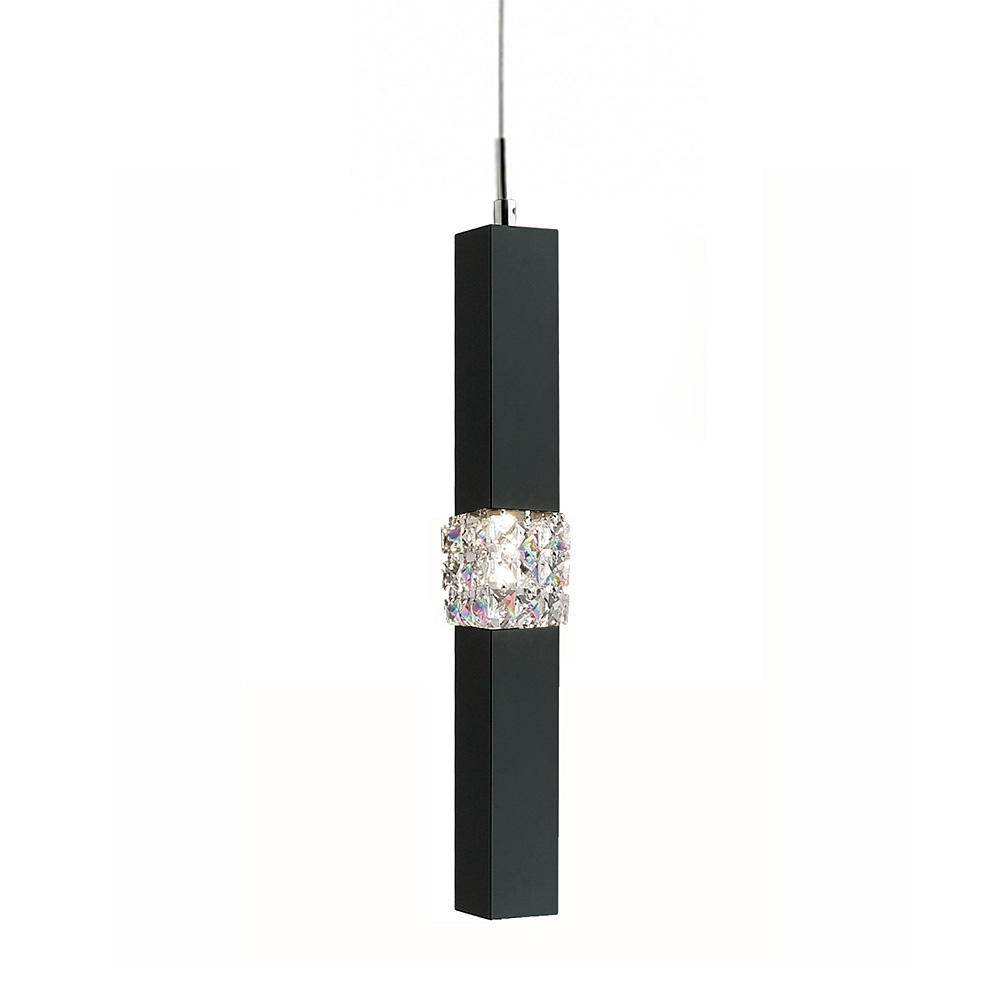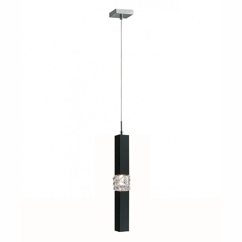 Подвесной светильник на хромированной арматуре. Двойной плафон выполнен из металла черного цвета с прозрачными хрустальными подвесками. Высота светильника регулируется до 120 см.