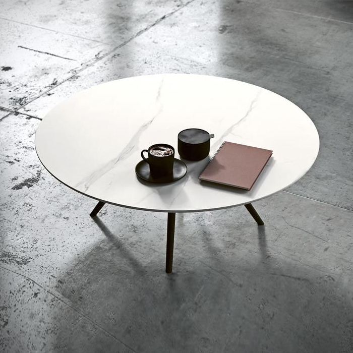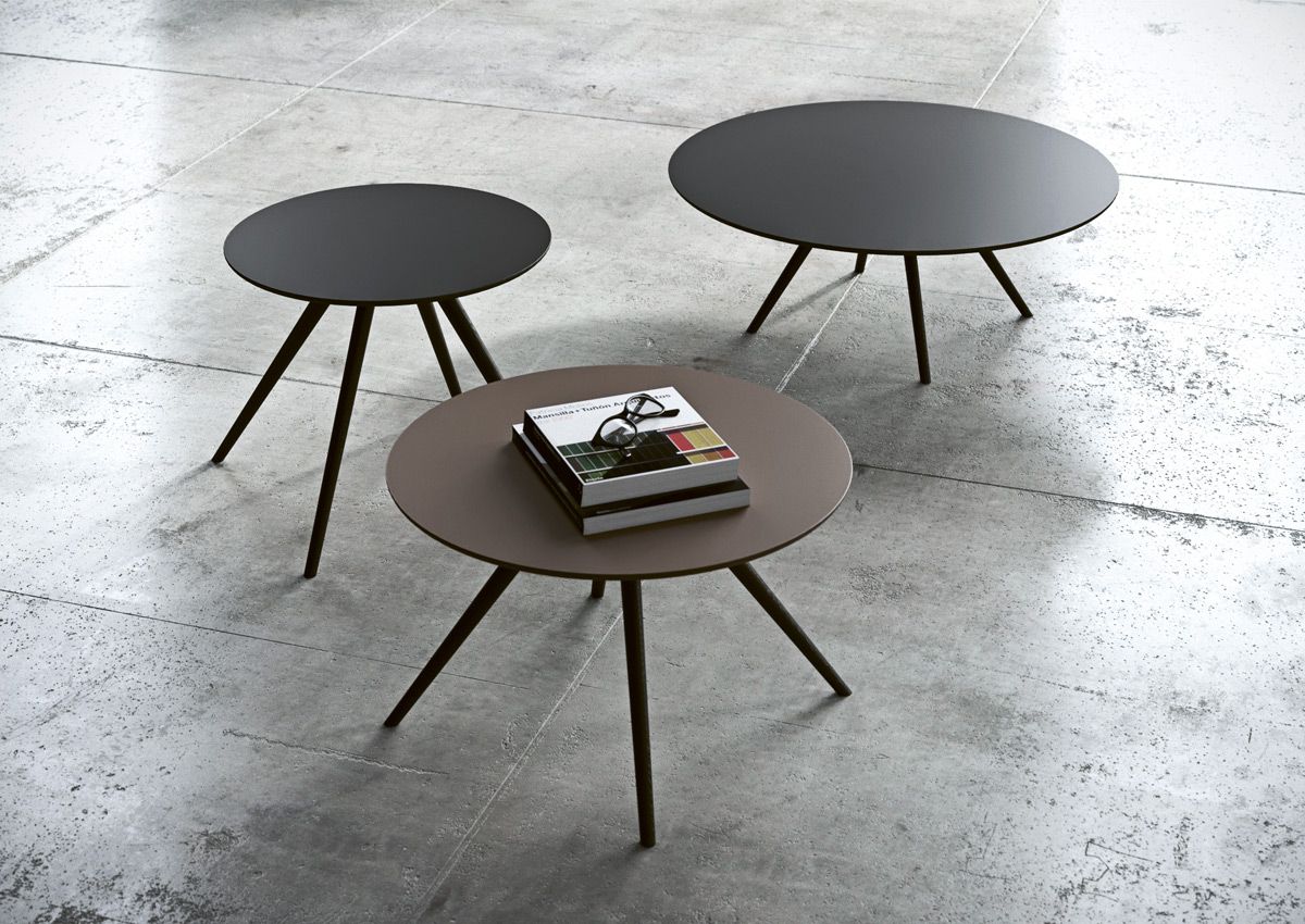 Кофейный столик Ufo диметром 80 см и высотой 30 см. Ножки из дуба темно-серого цвета (Rovere Ardesia), столешница под камень коричневого цвета (HPL Tribeka).