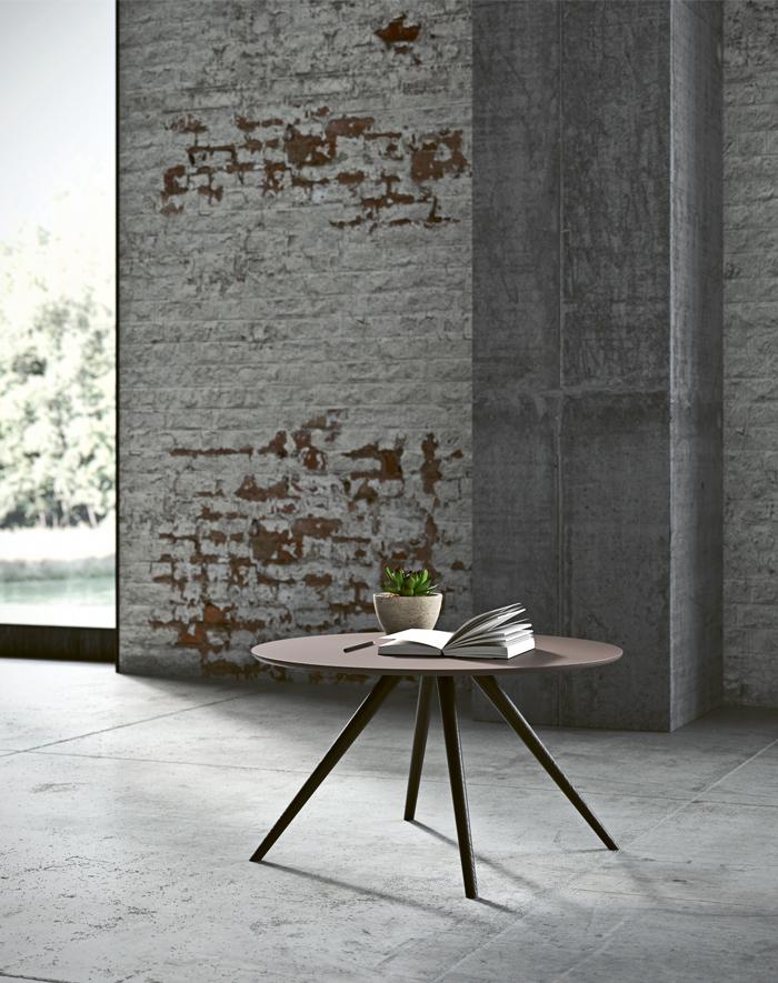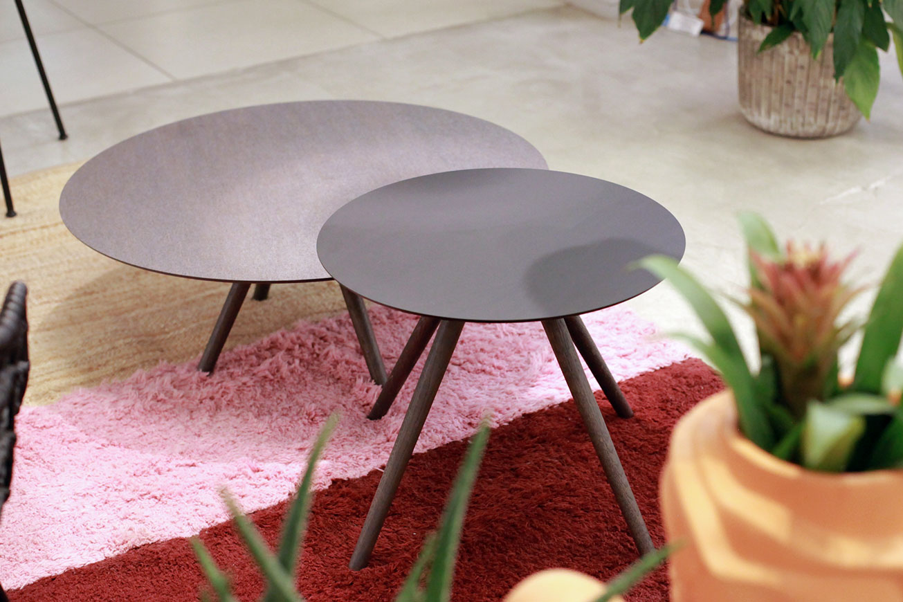 Кофейный столик Ufo диметром 80 см и высотой 30 см. Ножки из дуба серо-коричневого цвета (Slate Grey), столешница под камень серого цвета (HPL Dark Tribeka).