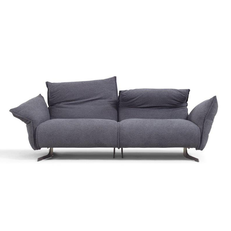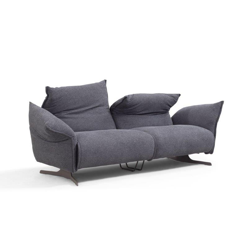 Небольшой 4-х местный диван в ткани темно-серого цвета. Подлокотники и задние подушки имеют специальных механизм, позволяющий менять их конфигурацию, наклонять полностью или частично. Ножки из металла коричневого цвета.