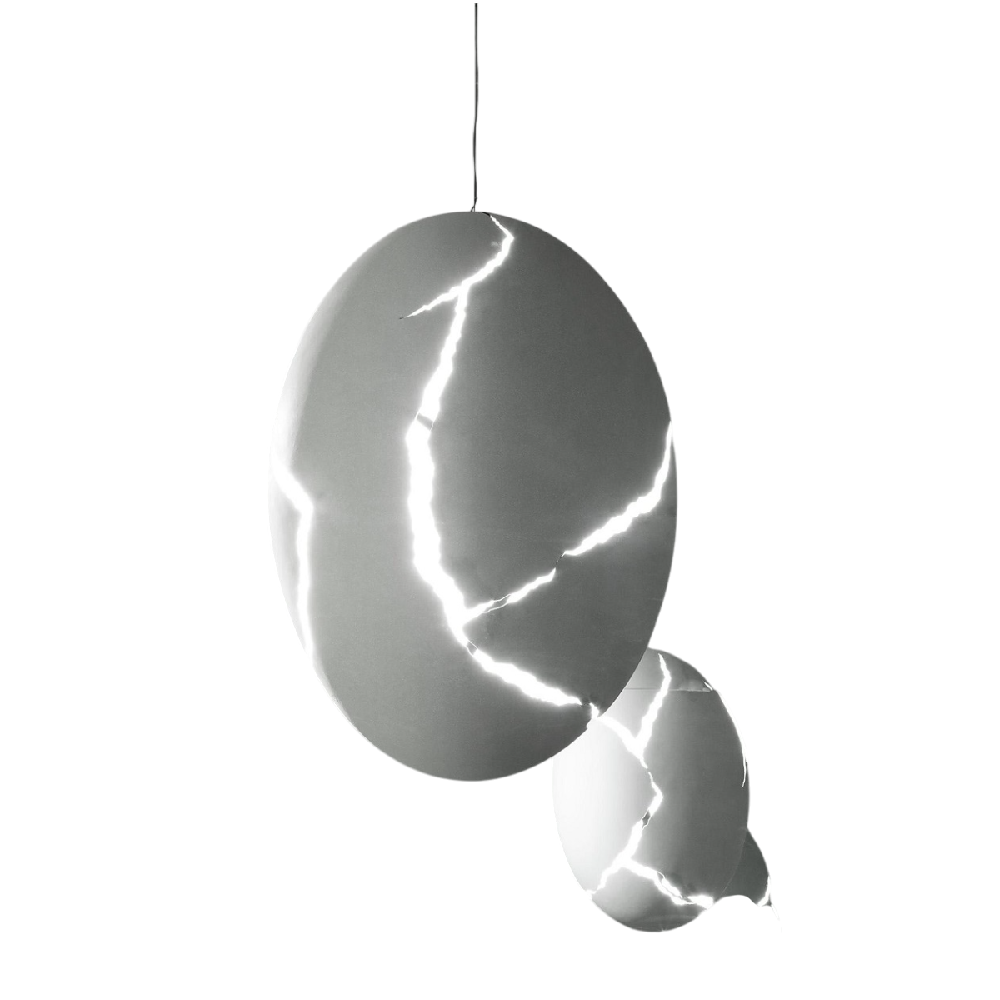 Концептуальный эксклюзивный проект, облаченный в знакомое и между тем необычное интерьерное решение — «разбитое яйцо» — был разработан и изготовлен на заказ семнадцать лет назад. Алюминиевая каркасная форма создана вручную и покрыта специальным материалом на основе яичной скорлупы. Пространство освещается сквозь имитацию трещин. Возможен вариант с отверстием внизу абажура. Дальнейшая информация предоставляется по запросу.