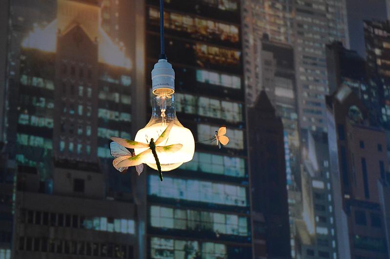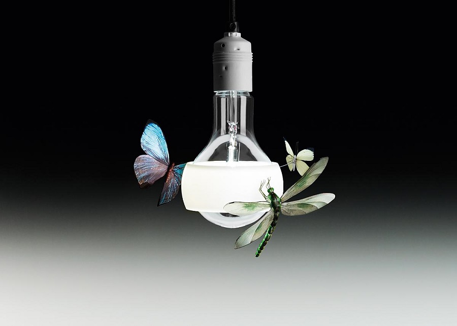 Подвесной светильник из коллекции Insekten-Modelle с объемным плафоном в форме каноничной лампочки, вокруг которой кружат стрекоза и две бабочки. Модели насекомых созданы полностью вручную и посажены на белое тефлоновое кольцо, создавая живую энтомологическую иллюзию в безупречном светотехническом исполнении.