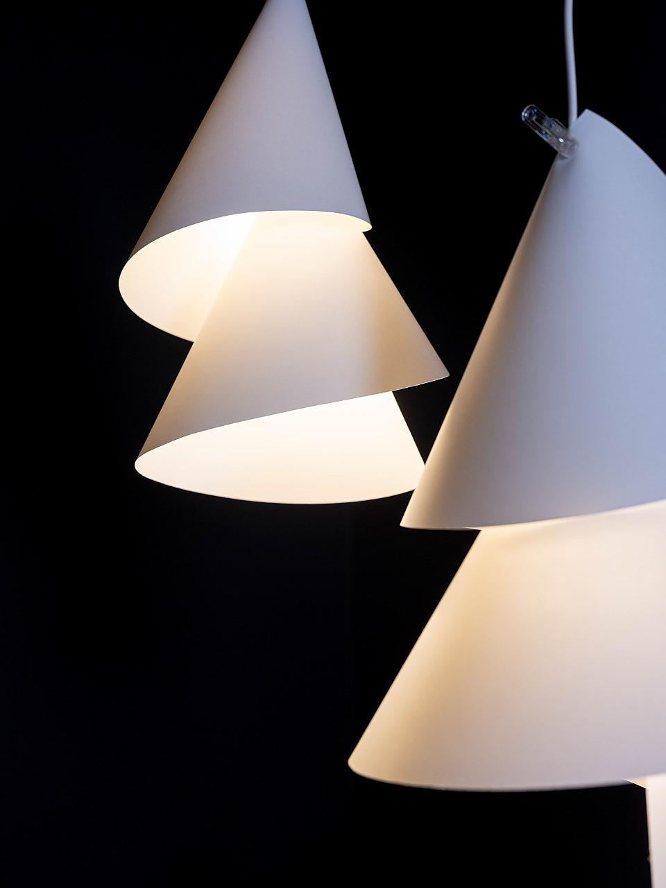 Белый полупрозрачный картон. Маленькая прозрачная прищепка. Регулируемая длина подвеса. Изменяемая форма абажура. Настоящая магия в гениальной простоте ингредиентов. Конусообразный светильник, сложенный из высококачественного полупрозрачного однородно-белого картона, скрепленного с белым проводом прозрачной японской прищепкой. Плафон легко поддается метаморфозам — можно придать светильнику индивидуальную форму и наблюдать волшебную игру света и тени: при плотно закрученном абажуре прямое освещение уменьшается до более приглушенного, а при широком расположении площадь светового покрытия увеличивается, задавая теплый тон большему пространству. Длина подвеса 450см легко регулируется с помощью троса.