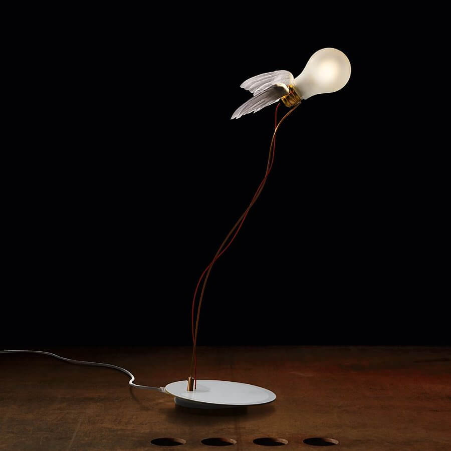 Летящая невесомая композиция, созданная для настольного освещения, Lucellino являет собой блестящую дизайнерскую находку Инго Маурэра. Окрыленная лампочка изящно парит над столом, надежно удерживаемая металлическим основанием. Крылья лампочки созданы вручную из гусиного пера.