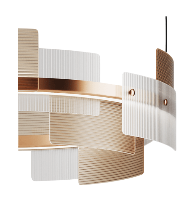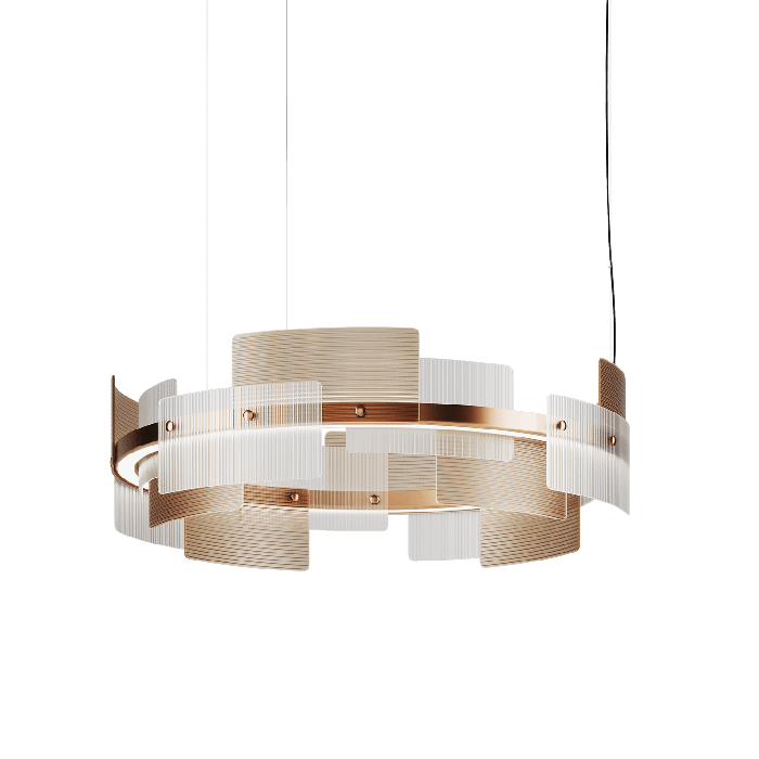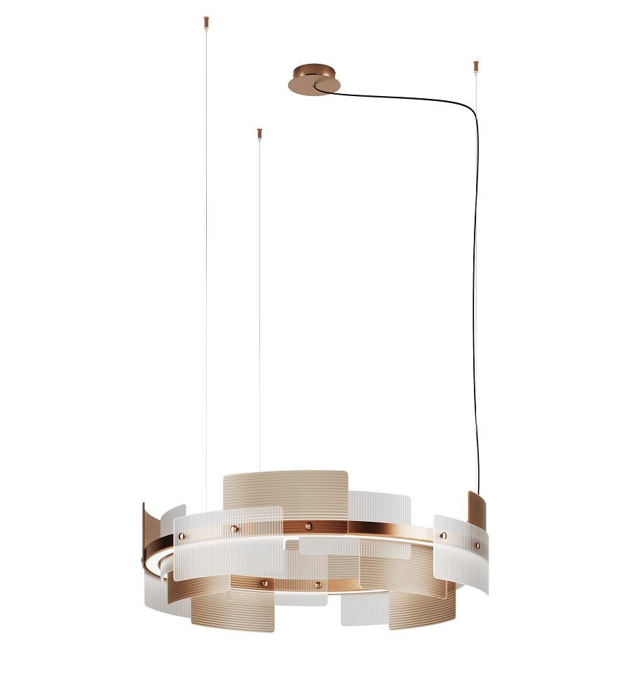 Элегантная люстра с регулируемым подвесом и широким цилиндрическим абажуром Halo 748/S100 Satin Bronze станет украшением любой гостиной. Металлический каркас в отделке сатинированной бронзы обшит перекрывающимися микроребристыми пластинами из сатинированного белого и золотисто-коричневого (тикового) стекла. Рассеиватели выполнены из опалового метакрилата.