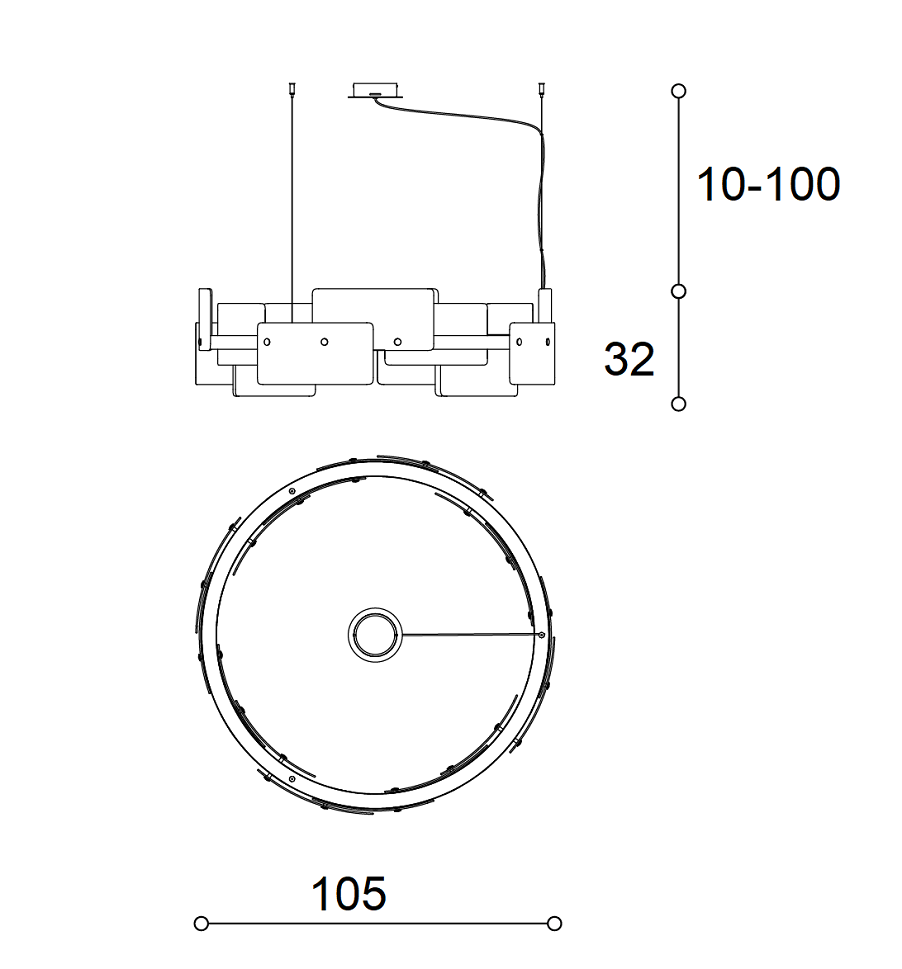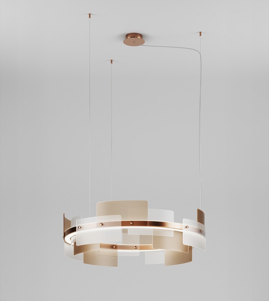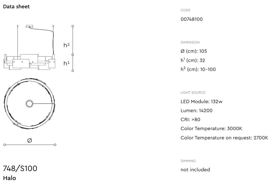 Цветовая температура 3000К обеспечивает мягкий теплый свет. По запросу доступно исполнение 2700К и диммирование DALI. Также представлена версия Halo Matte Midnight Grey с матово-серым металлическим каркасом и абажуром из белого и дымчатого сатинированного мелкоребристого стекла. Подвес регулируется от 10 до 100см.