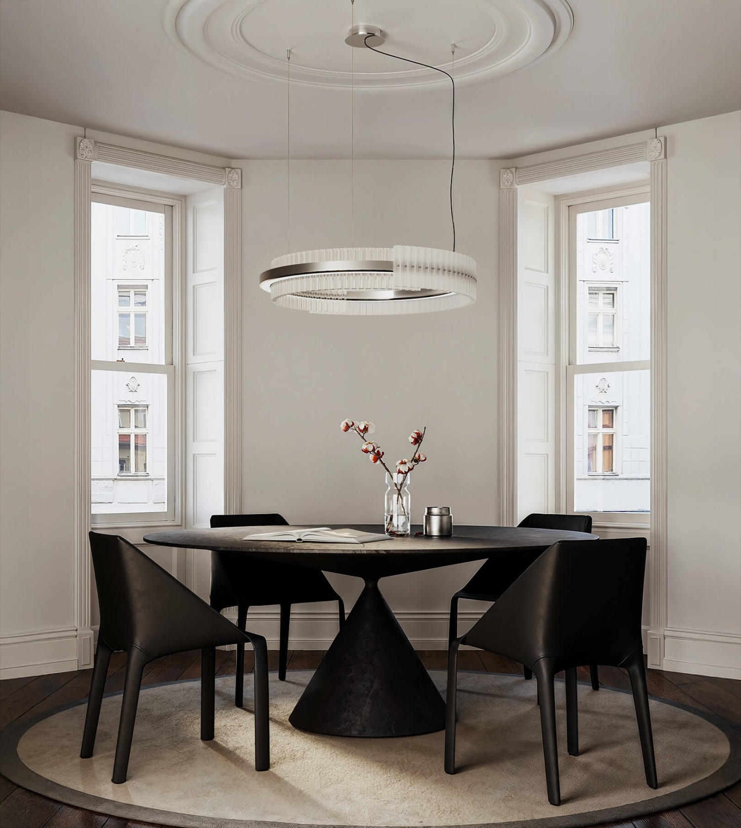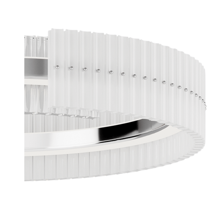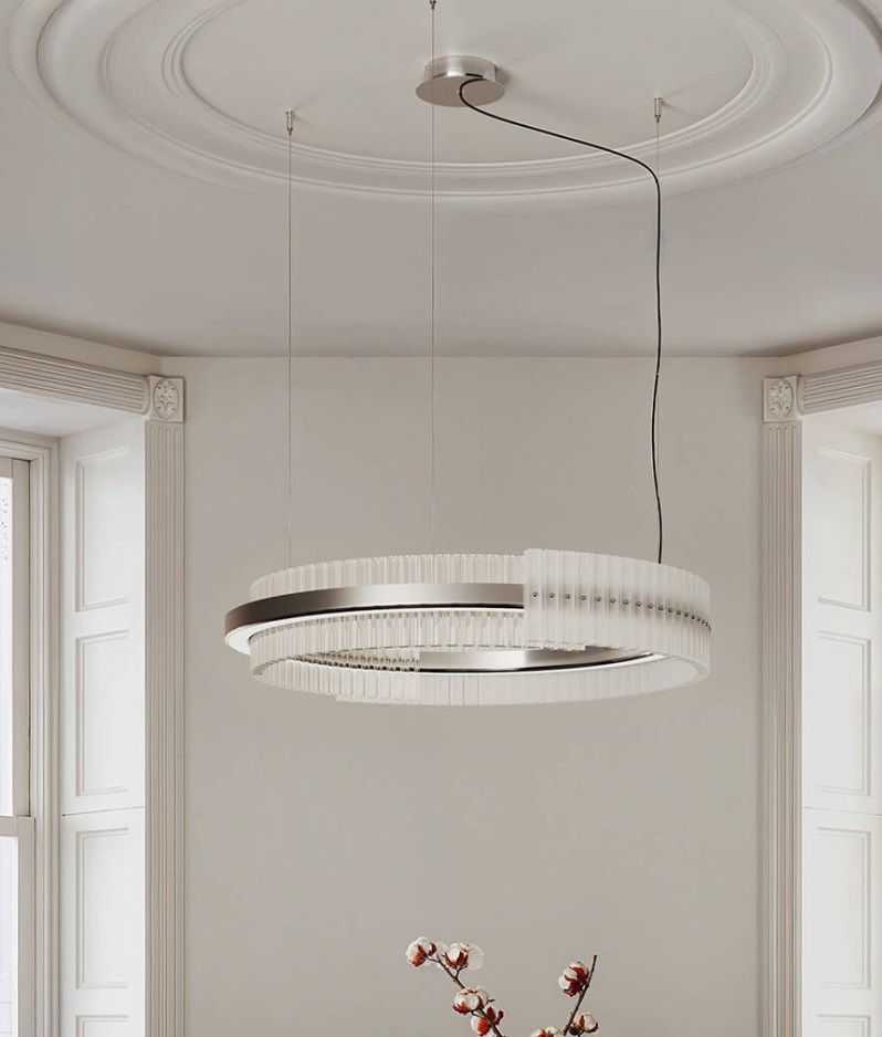 Подвесной светильник Rhea воплощает равновесие и легкость, словно парящее в воздухе объятие. Две широкие дуги образуют гармоничный круг с рельефным бортом из узких прозрачных и матовых пластин. Рассеиватель выполнен из опалового метакрилата.