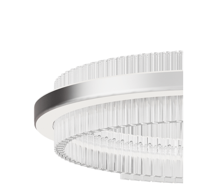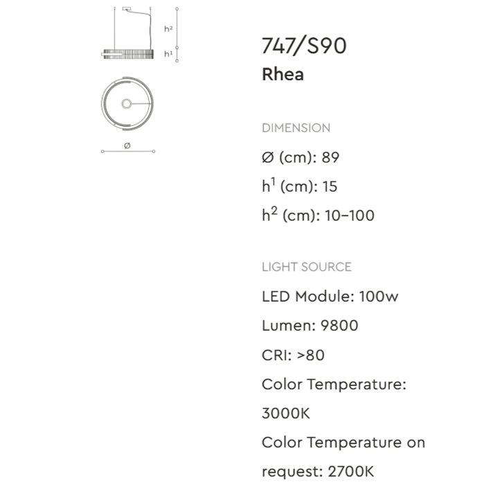 Стоимость указан за версию Rhea 747/S90 Chrome с хромированным каркасом, отделанным прозрачными и матовыми белыми пластинами. Представлена также версия в светло-золотистом каркасе с прозрачными и сатинированными пластинами. Длина подвеса регулируется от 10 до 100см. Базовая цветовая температура 3000К, по запросу возможно исполнение 2700К, а также диммирование 1-10V, DALI, CASAMBI.
