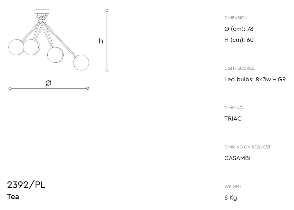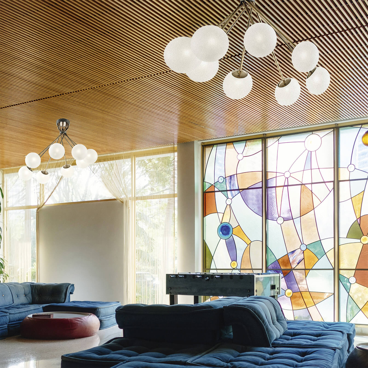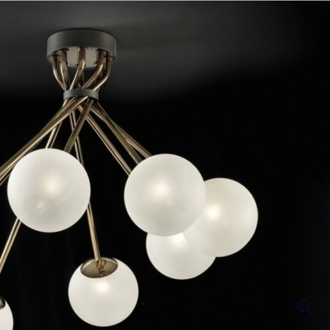 Металлический каркас выполнен в матовой отделке никелевого золота с деталями антрацитового цвета, восемь шарообразных рассеивателей изготовлены из выдувного белого сатинированного стекла. Также доступна версия с матово-черным каркасом.