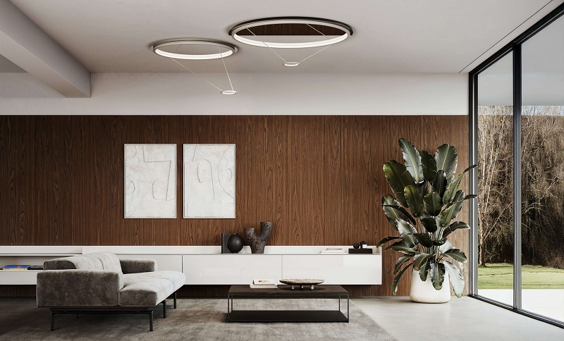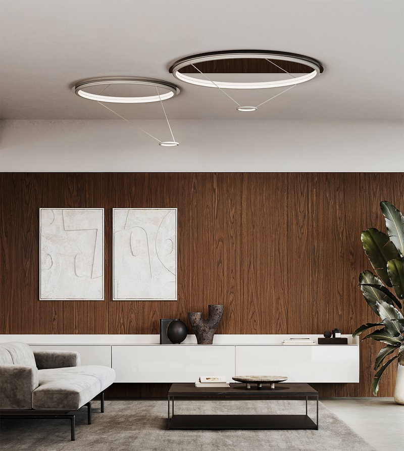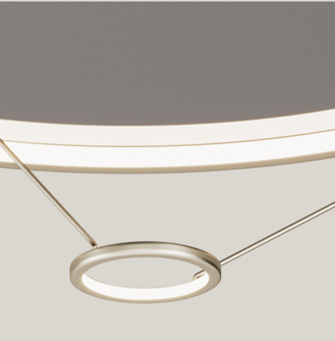 Светящиеся кольца Loop разного диаметра со встроенными LED-источниками, расположенные одно под другим, создают приятную игру воздушно-зеркальных отражений, объёмов и перспектив, преображая и облегчая пространство.