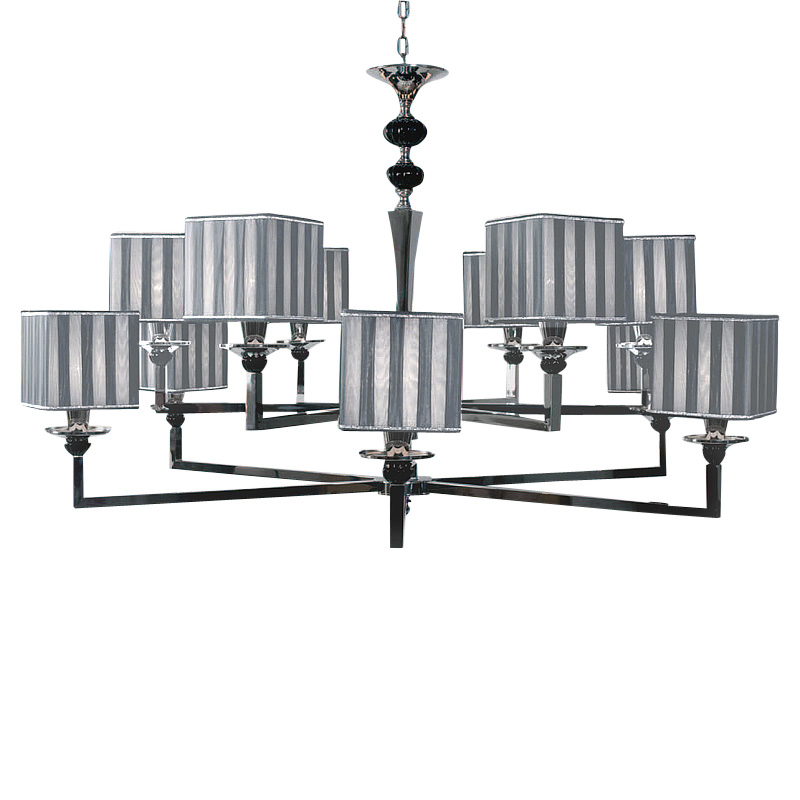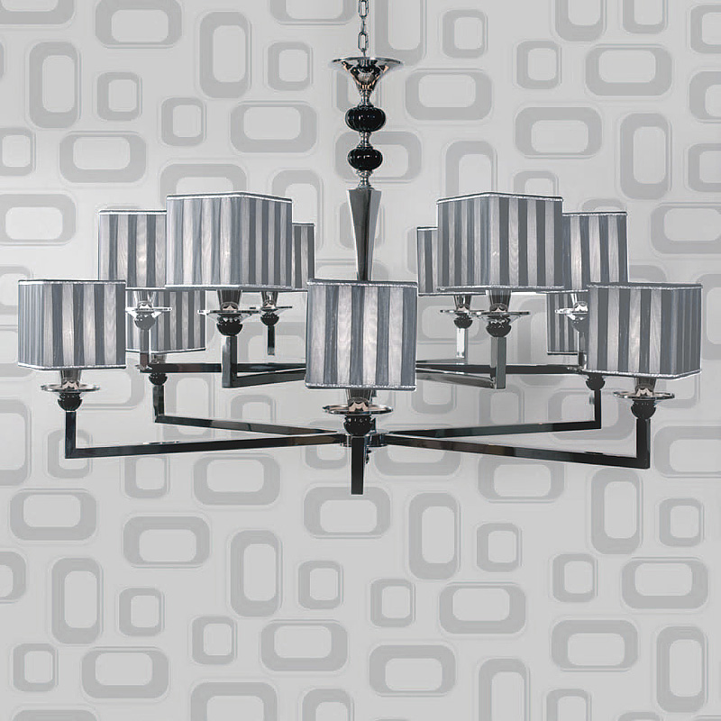 Люстра из коллекции Madreperla. Текстильные абажуры серого цвета. Арматура из хромированной латуни. Шары из прозрачного муранского стекла на арматуре.