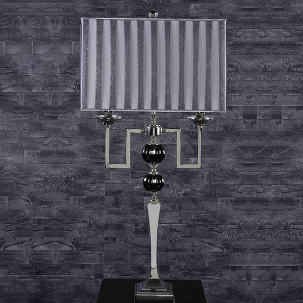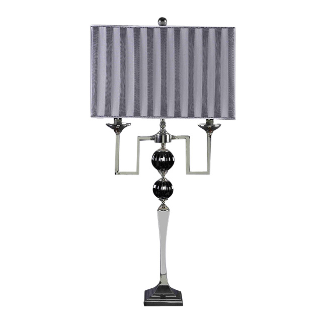 Настольная лампа из коллекции Madreperla. Текстильный абажур серого цвета. Арматура из никелированной латуни и железа. Черные шары из хрусталя на арматуре.