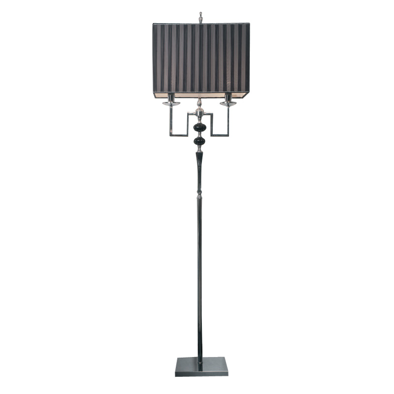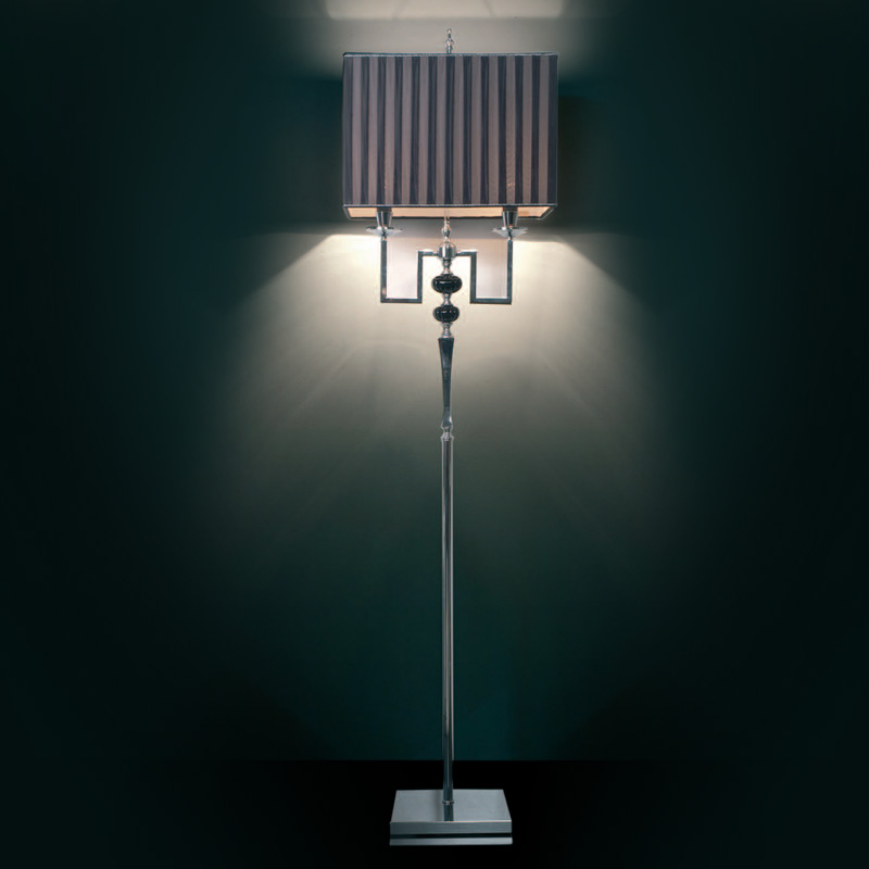 Торшер из коллекции Madreperla. Текстильный абажур черного цвета. Арматура из никелированной латуни и железа. Декор - черные шары из муранского стекла.