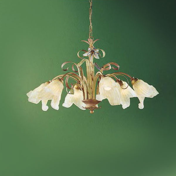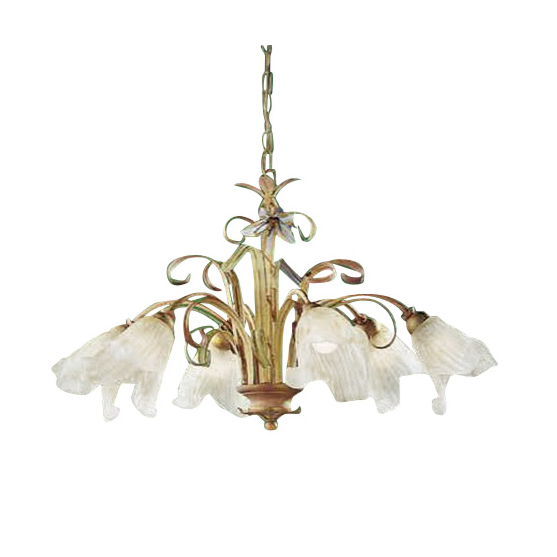 Люстра 6-ти рожковая на металлической арматуре бежевого цвета с зеленой патиной. Структуру украшают декоративные металлические стебли и цветы. Плафоны выполнены из матового стекла белого цвета. Высота светильника регулируется за счет звеньев цепи.