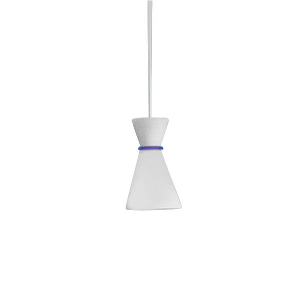 Подвесной светильник на металлической арматуре серого цвета. Плафон выполнен из стекла белого цвета с синей полоской. Высота светильника регулируется.