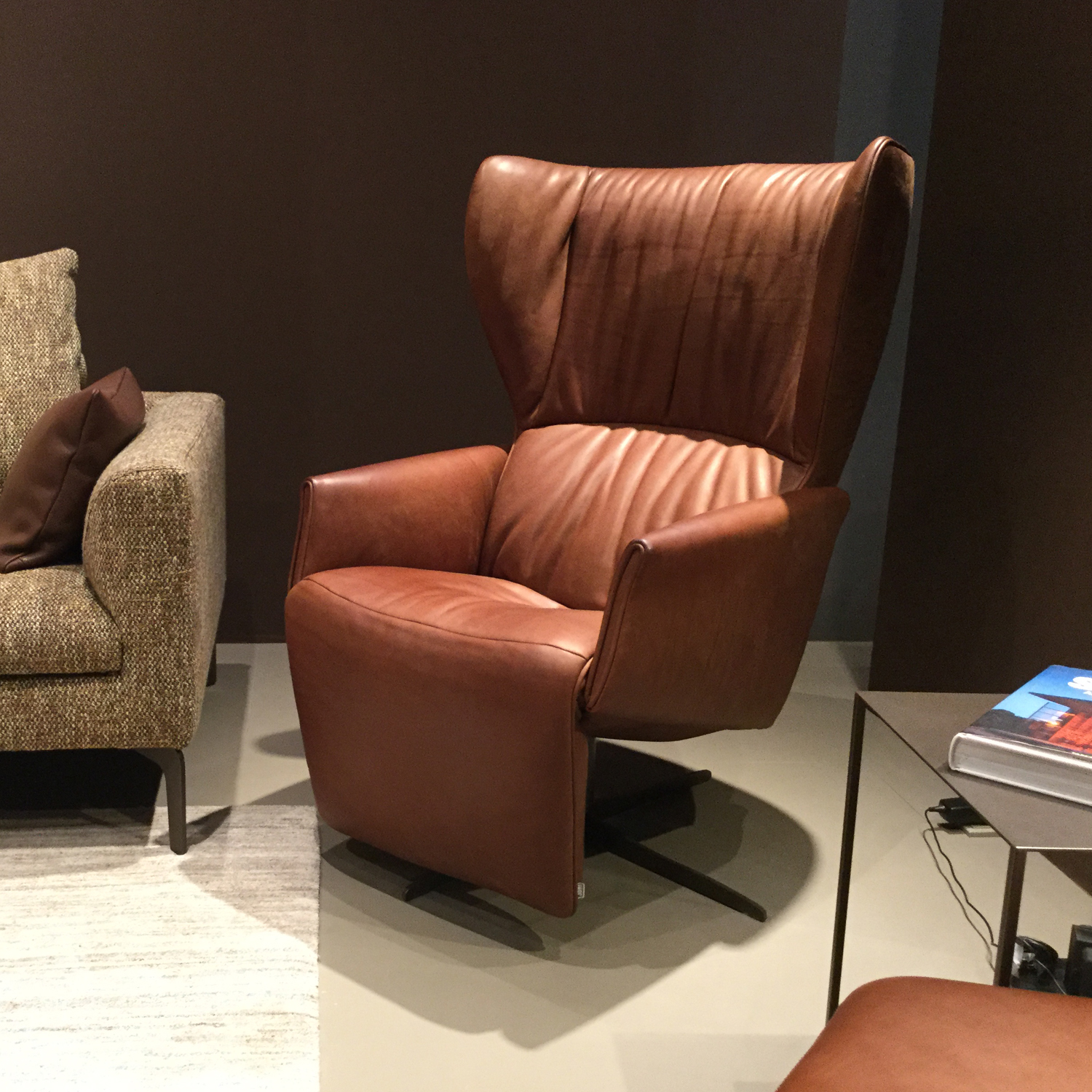 Раскладывающееся кресло Rapsody reclining с механизмом "mono-move" (подножка и спинка опускаются и поднимаются только вместе). Реклайнер доступен в размерах Mini, Medi и Maxi. Размеры приведены для кресла Medi, подходит для людей ростом от 1,65 до 1,85 метра, максимальная нагрузка до 120 кг. Кресло выполнено в натуральной коже коричневого цвета (Lotila pralina). Основание из металла черного цвета. Для заказа доступны другие цвета.