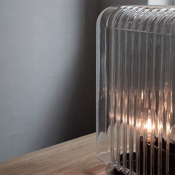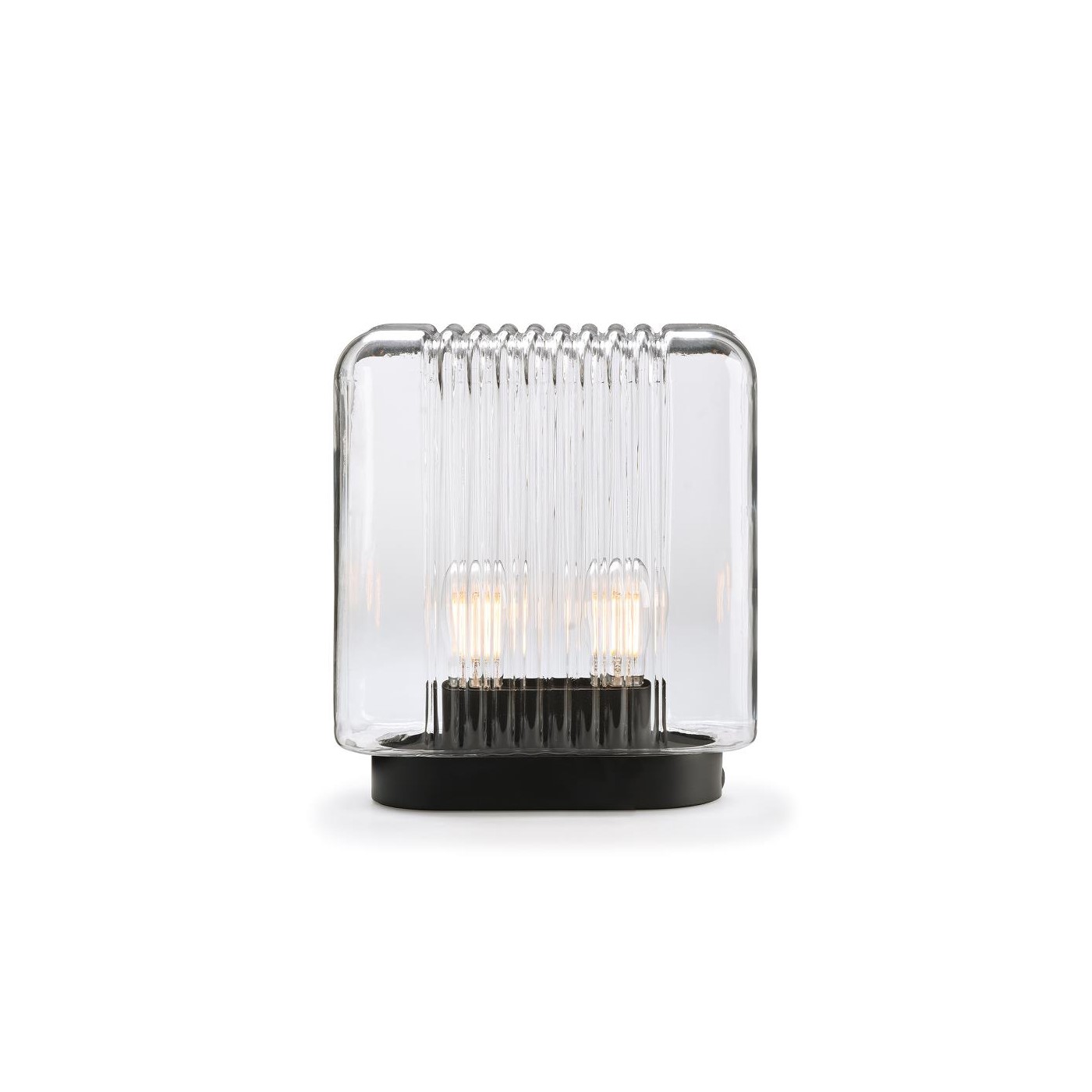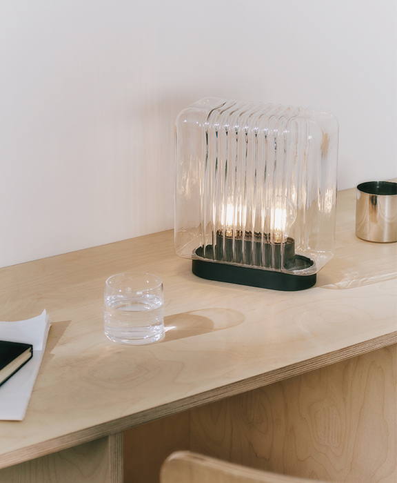 Портативная настольная лампа Karakter Lari Mini. Cостоит из одного куска выдутого стекла с рифленой структурой, прикрепленного к металлическому основанию с порошковым покрытием черного цвета. Lari mini заряжается через кабель USB-C, полная зарядка за 3,5–4 часа. При полной зарядке до 14 часов автономной работы.