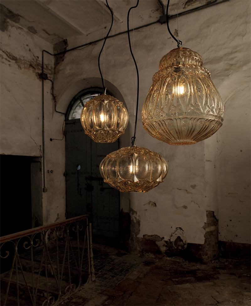 Подвесной светильник из коллекции Ginger. Плафон выполнен из стекла бледно-желтого цвета и имеет сложную поверхность с множеством узоров. (артикул SE116 3A INT)