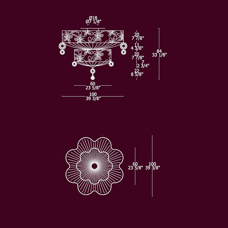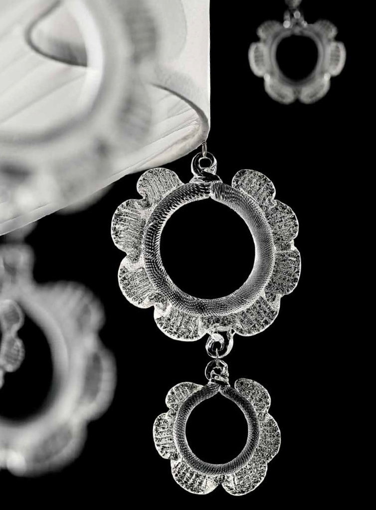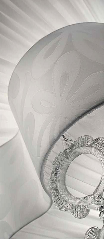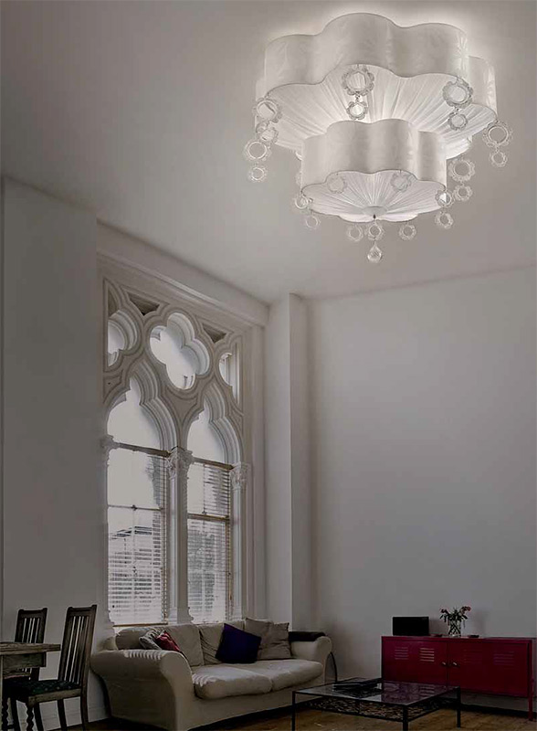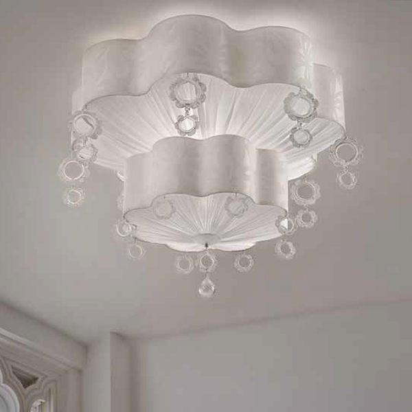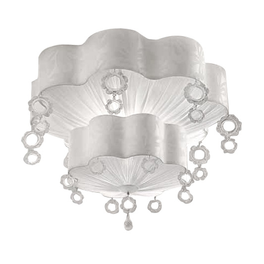 Потолочный светильник из коллекции GISELLE с двухуровневым абажуром из ткани белого цвета. Подвески из хрустального стекла с серебряными листьями, полностью обработанными вручную. Арматура: металл, покрытый жемчужно белым лаком. Дизайн: Marina Toscano. Арт. GISELLE PL 100+60 (Gallery)