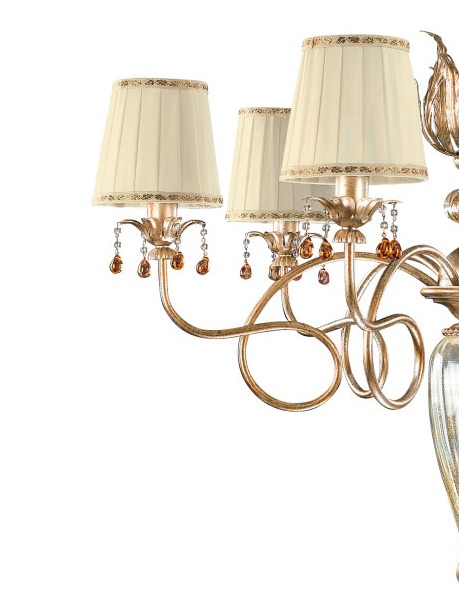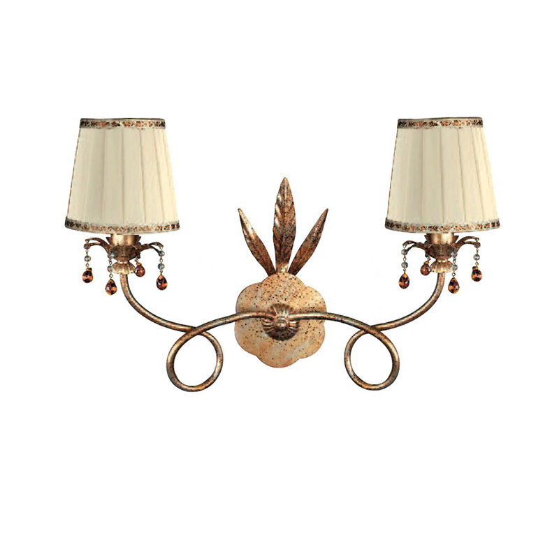 Бра 2х-рожковое на металлической арматуре цвета античное золото с эффектом состаривания (патиной). Декор - подвески из муранского стекла янтарного цвета. Текстильные абажуры цвета слоновая кость с золотым кантом скрывают лампы.