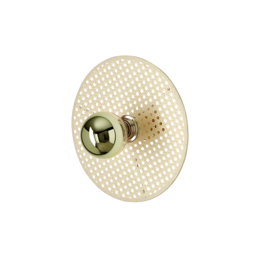 Настенный/потолочный светильник Aromas Del Campo из коллекции Tan Tan. Арматура из металла глянцевого золотого цвета. Декоративный элемент в виде диска из ротанга натурального бежевого цвета.