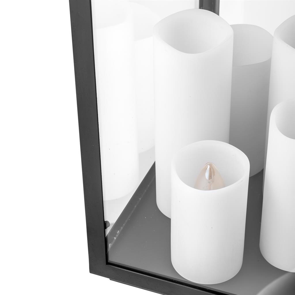Настольная лампа Table Lamp Debonair в металлической рамке черного цвета. Створки плафона из прозрачного стекла. Внутри плафона расположены декоративные свечи разного размера.