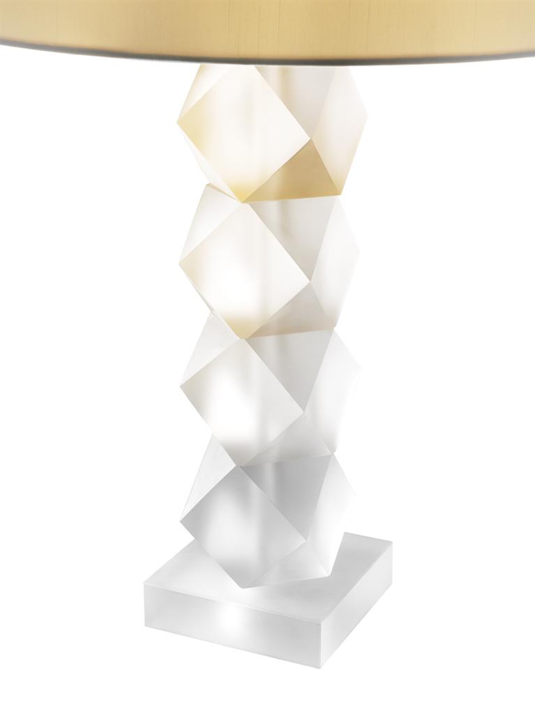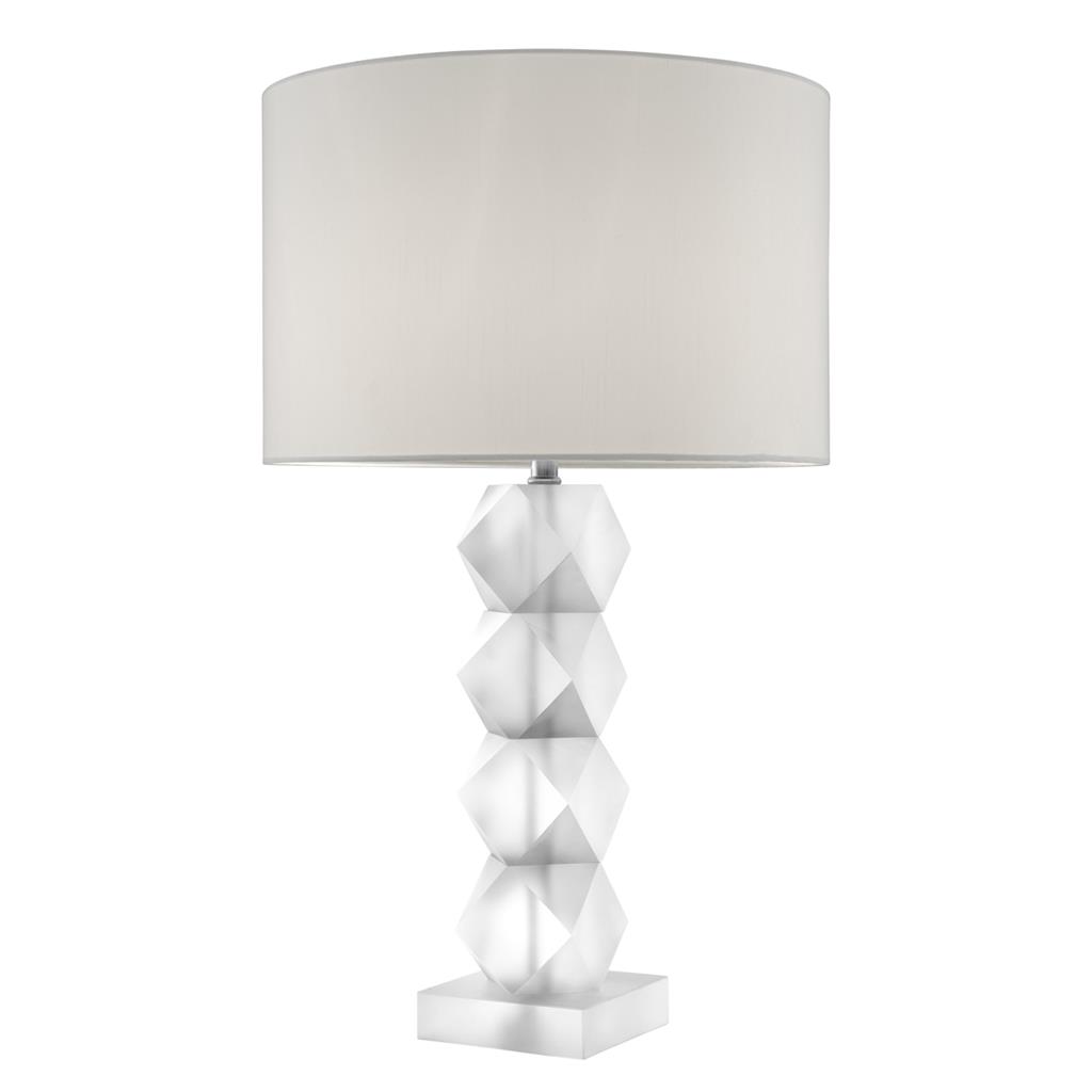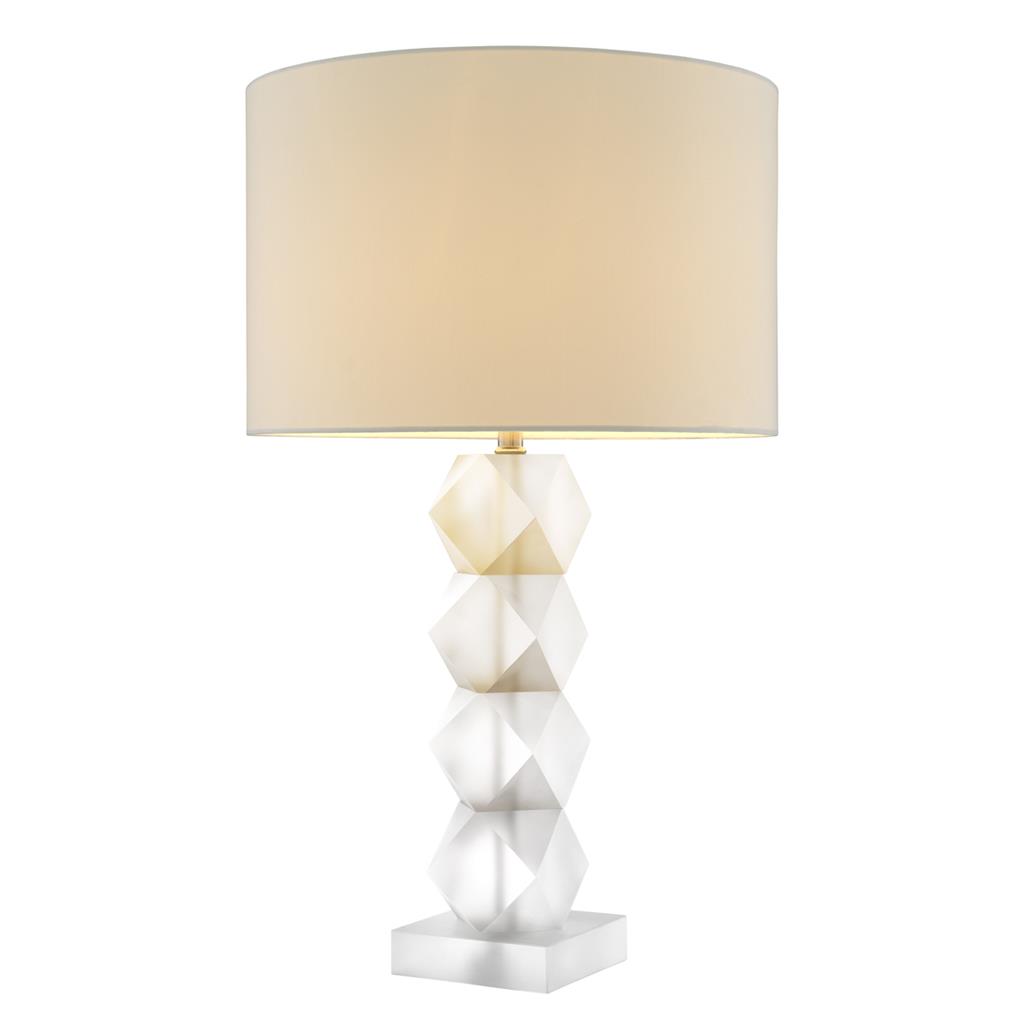 Настольная лампа Table Lamp Whealon на фигурном основании из прозрачного стекла. Текстильный абажур песочного цвета скрывает лампу.