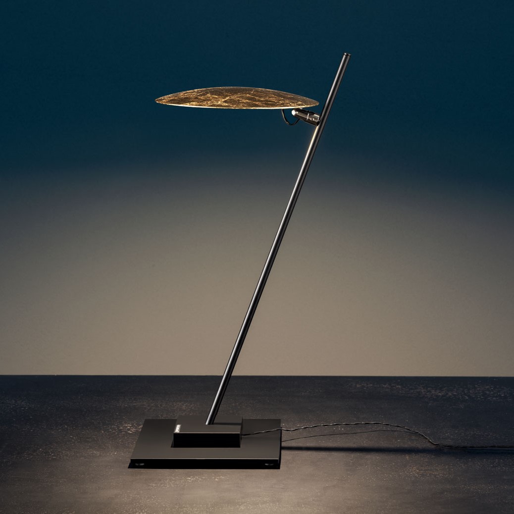 Настольная лампа Catellani and Smith из коллекции Lederam выполнена полностью из металла. Диск со встроенным светодиодным источником света золотого цвета, черный стержень и черное основание с кабелем и диммером.