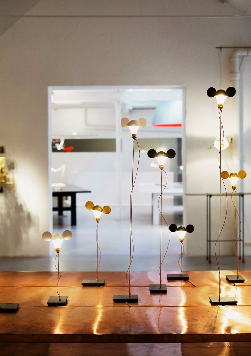 Светильник доступен в черной, белой, красной или латунной «шапочке». Основание выполнено из стали и покрыто краской антрацитового цвета.