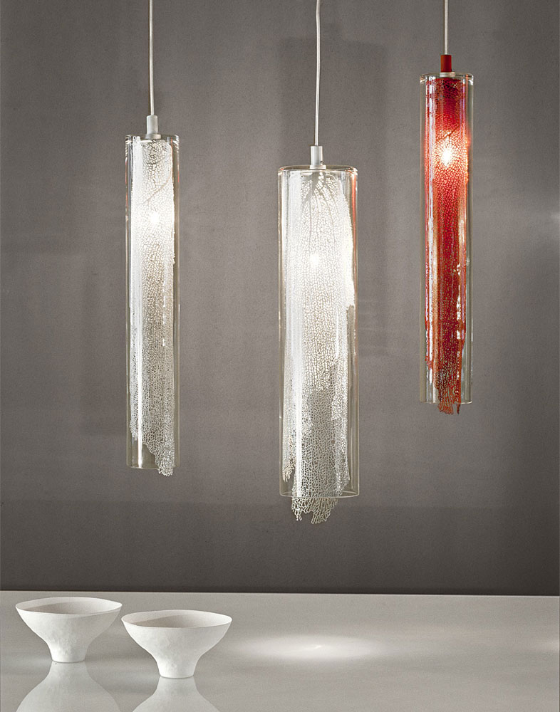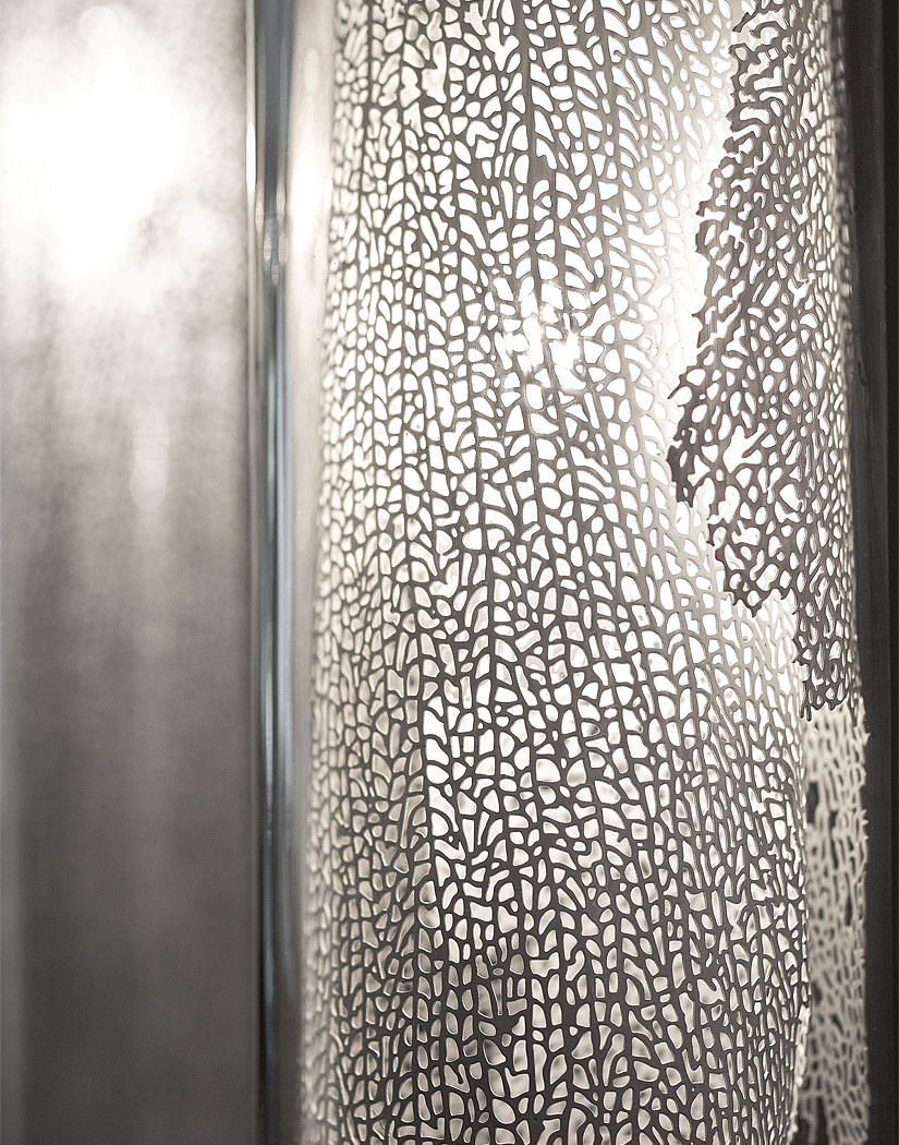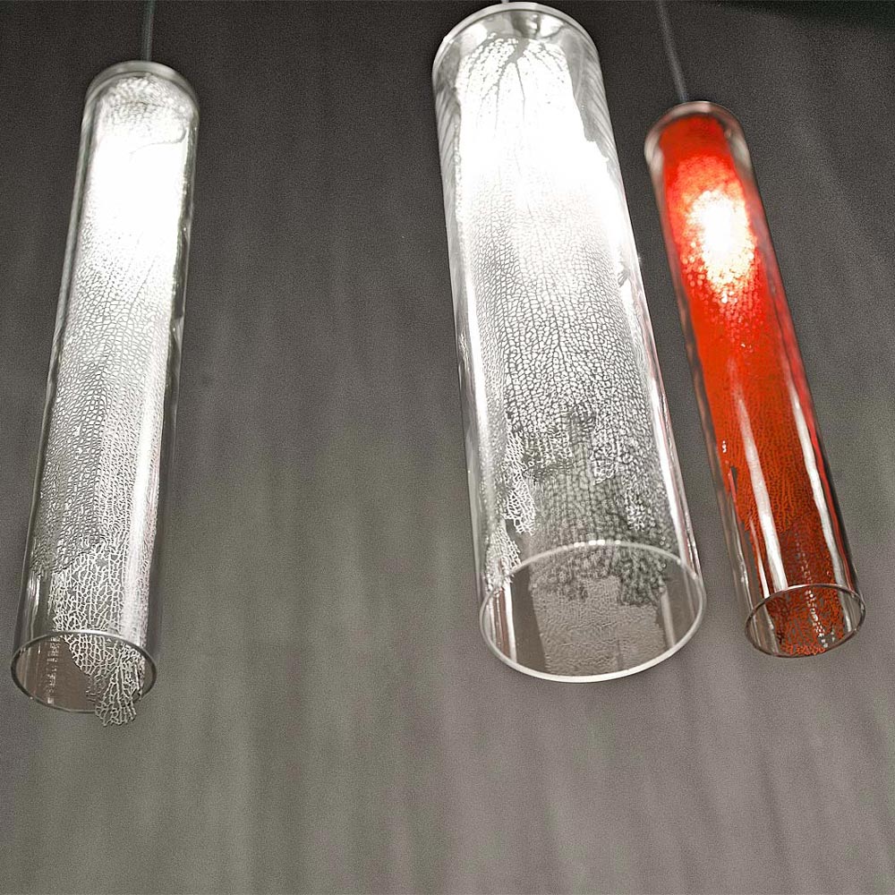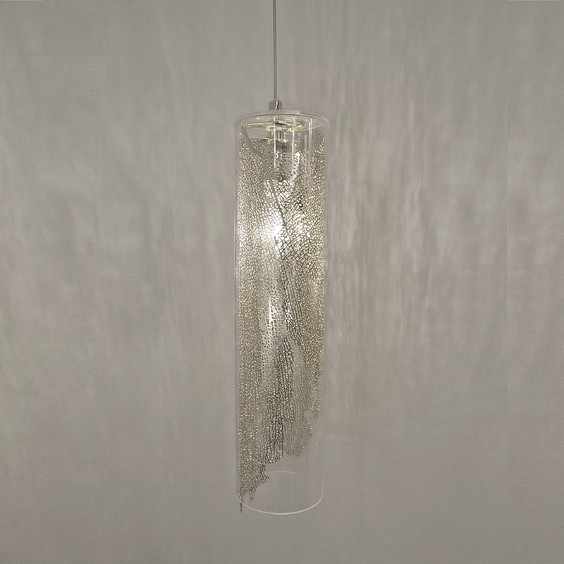 Подвесной светильник Terzani из коллекции Frame. В прозрачную колбу из боросиликатного стекла вложен металлический лист в виде корала серебряного цвета. Скрытый внутри, как в луковице, источник света создает внутреннее свечение металлического листа. Благодаря неравномерной структуре отверстий в "кораловом листе", имитирующей неповторимость в природе, свет смешивается и создает динамическую светотень. Цвет металла может быть: белый, красный, позолоченный или посеребренный. Дизайн Terzani LAB.