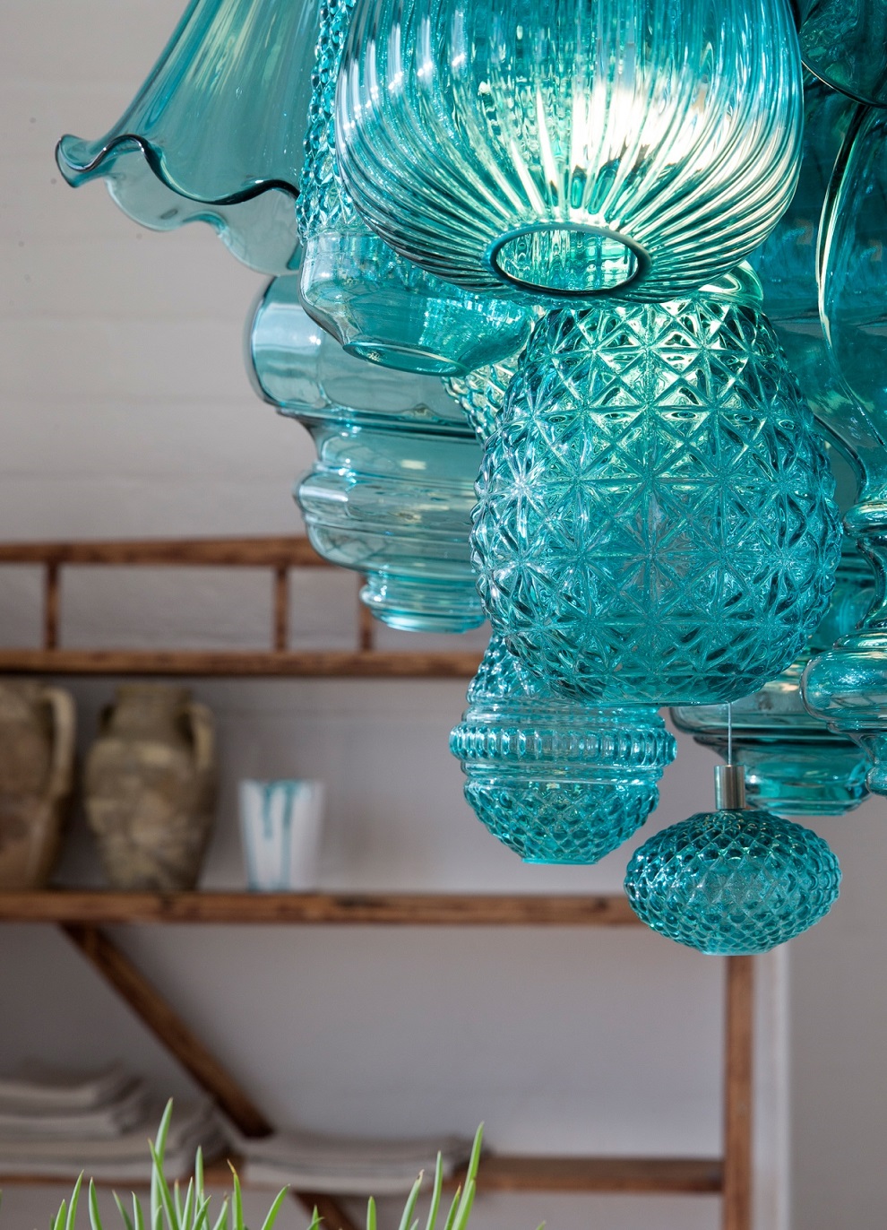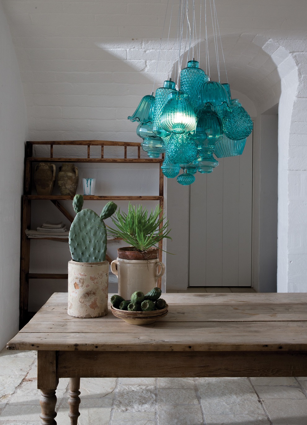В Ceraunavolta соединяются семнадцать разных абажуров, формы которых заимствованы из классических моделей 70-х годов. Абажуры выполнены из выдувного прозрачного и полированного голубого стекла Тиффани. Коллекция включает светильники с 12-ю и 17-ю абажурами, а также роскошные необычные люстры с 22-мя элементами.