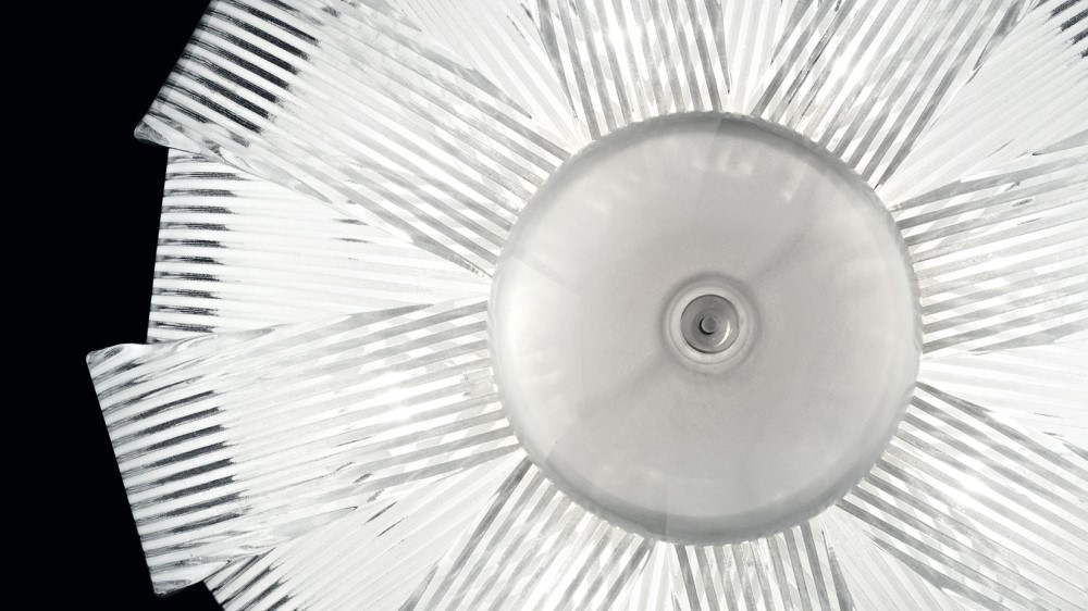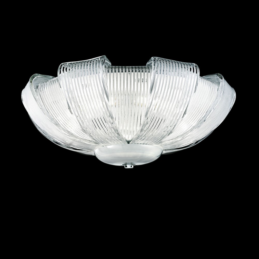 Потолочный светильник Barovier&Toso 6700 из коллекции Plisse. Запатентованная Barovier & Toso технология изготовления стеклянных элементов позволяет получить регулярный эффект белых полос на прозрачных стеклянных элементах. Металлические детали покрыты белой эмалью. Муранское стекло ручной работы от лучших итальянских мастеров.