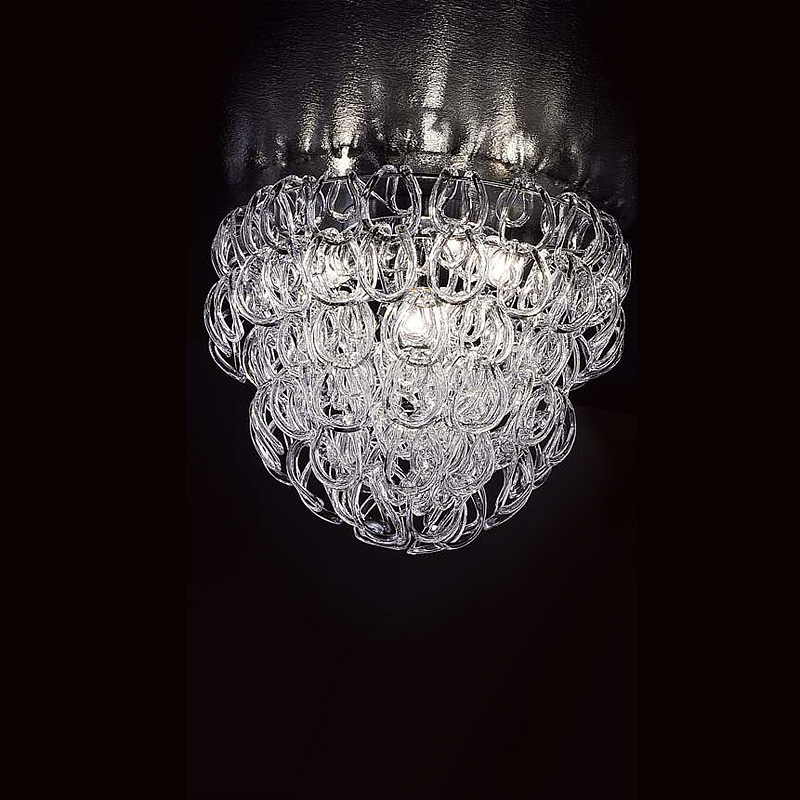 Потолочный светильник из коллекции GIOGALI на хромированной арматуре. Плафон из прозрачного муранского стекла выполнен в виде фигурных петель. Дизайн: Angelo Mangiarotti.
