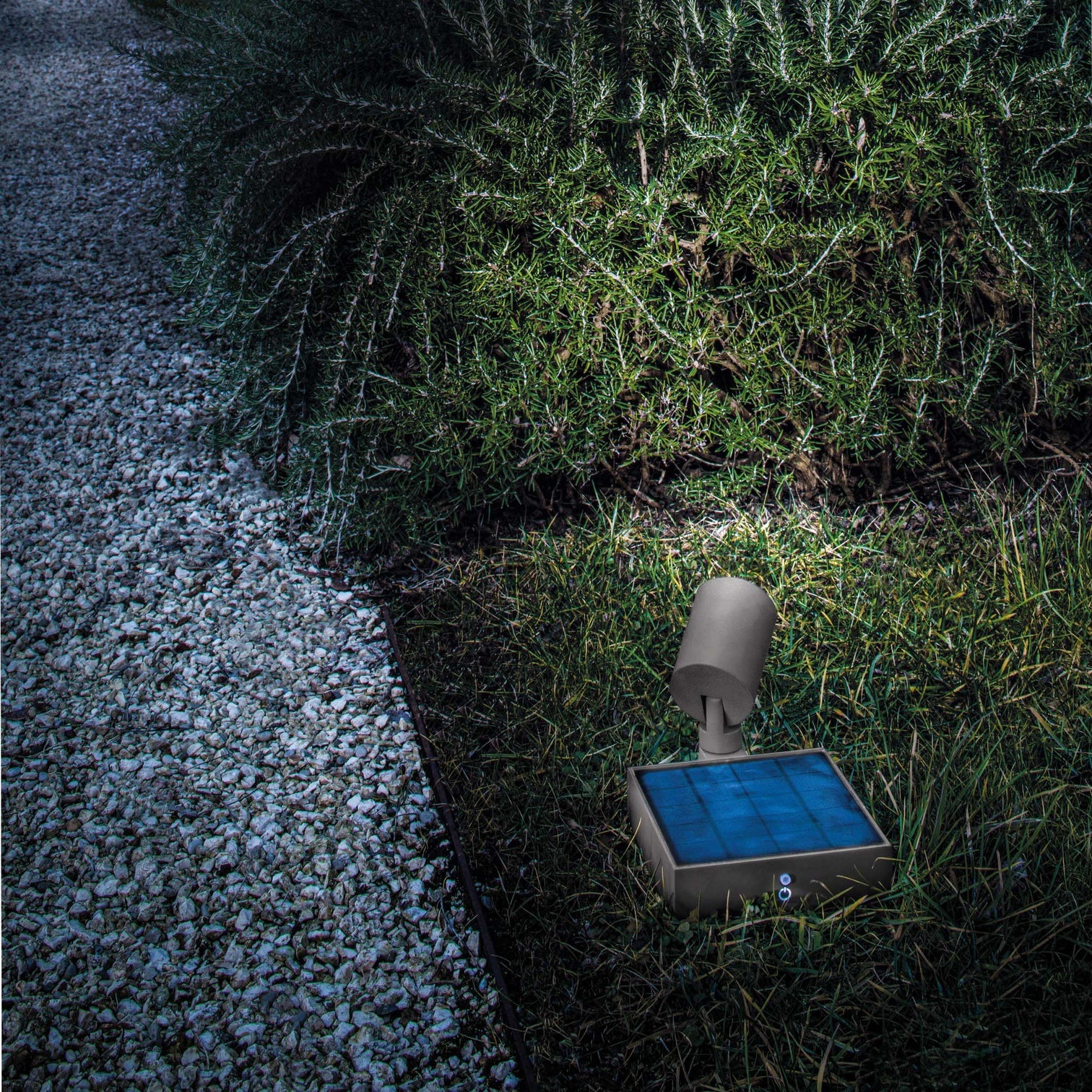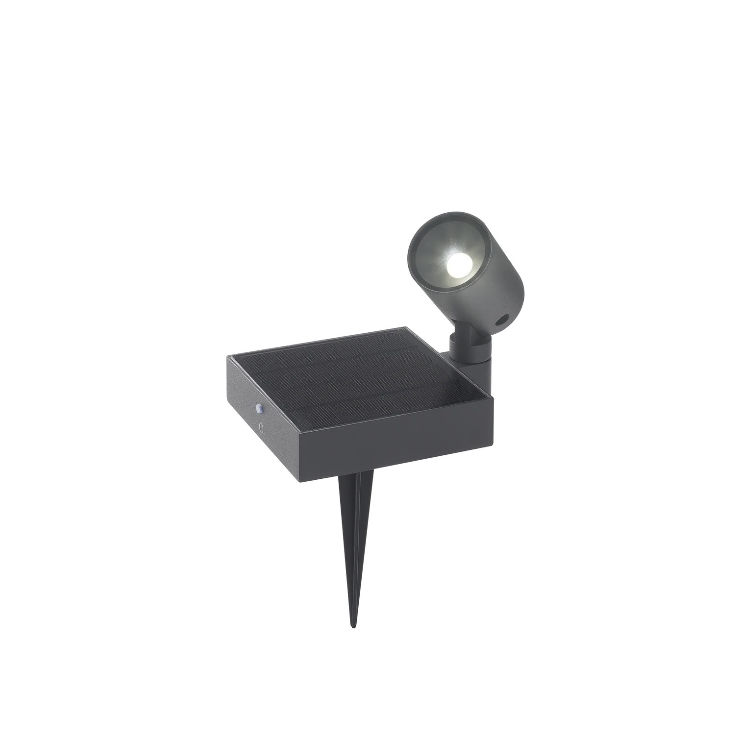 Регулируемый прожектор Zafferano Solar Dark grey из литого под давлением алюминия, окрашенного в темно-серый цвет, с рассеивателем из поликарбоната. Светильник Solar предназначен для использования на открытом воздухе, оснащен солнечной панелью для подзарядки аккумулятора (сменной) и имеет высокий класс защиты IP (IP65).
