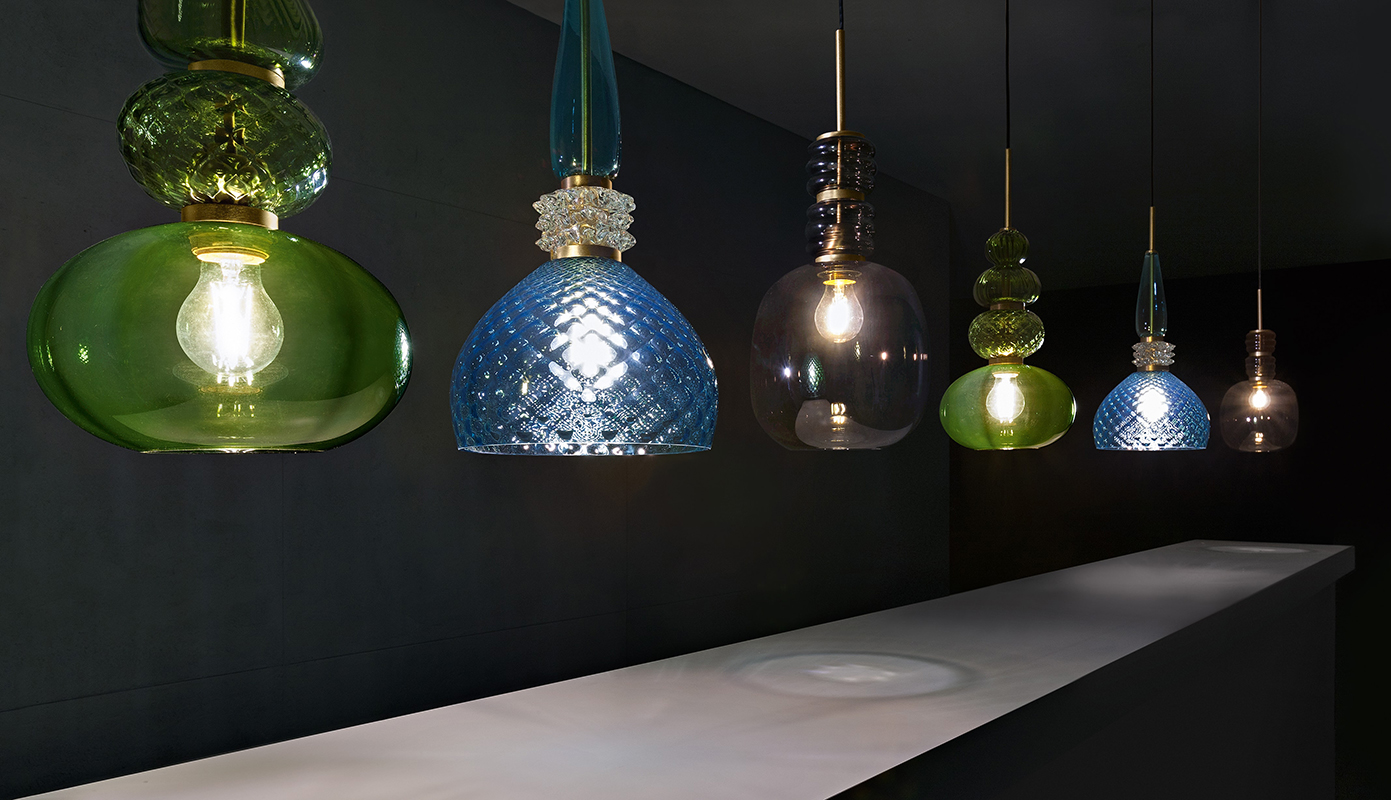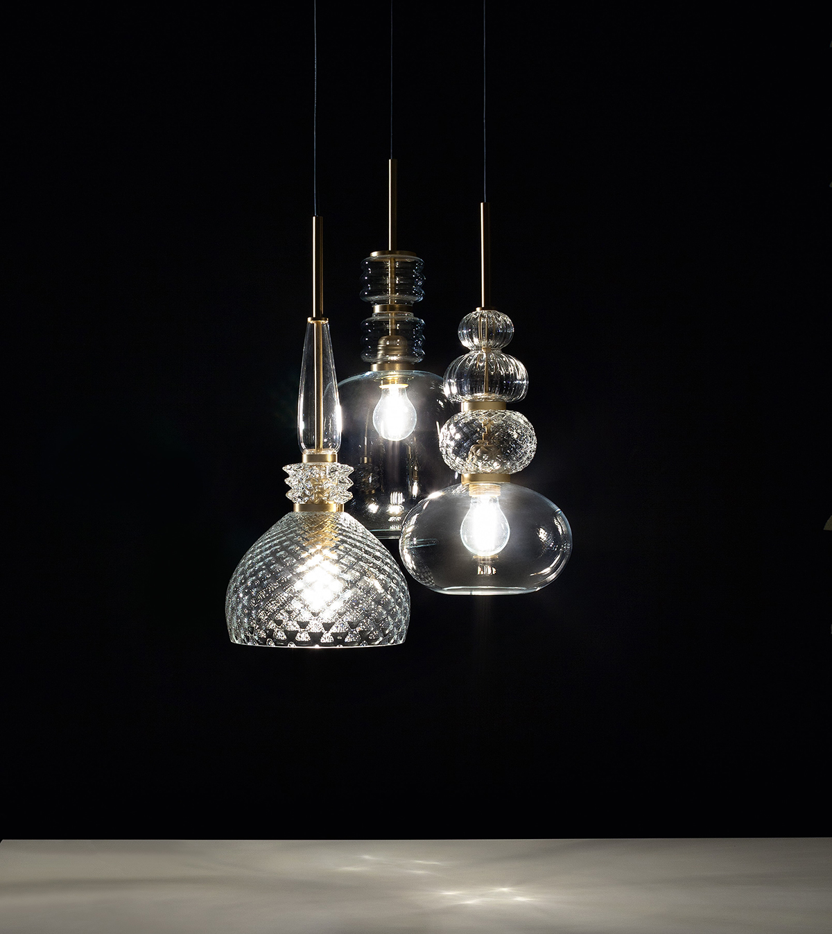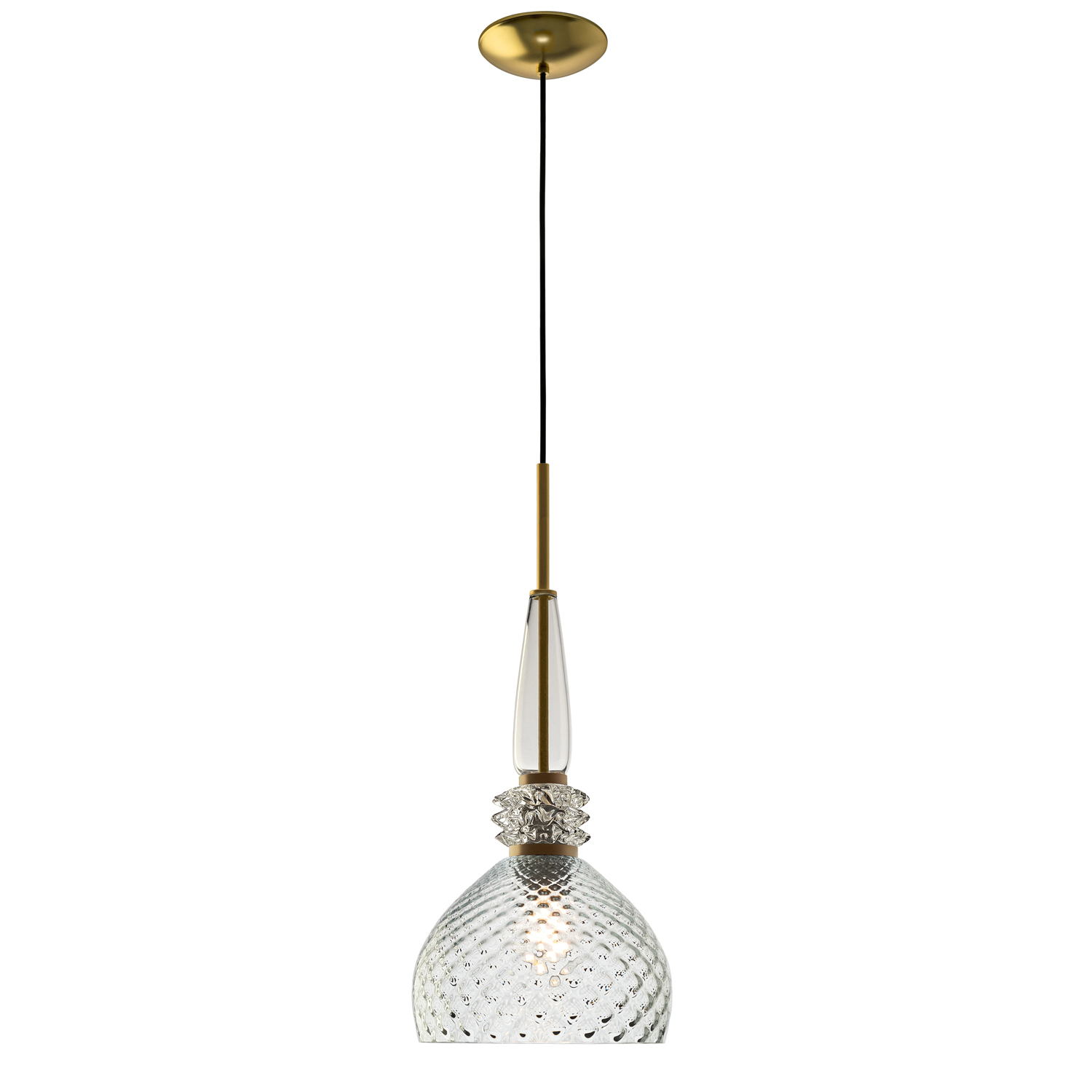 Подвесной светильник из коллекции Carnival из прозрачного стекла ручной работы. Металлические части цвета латунь.