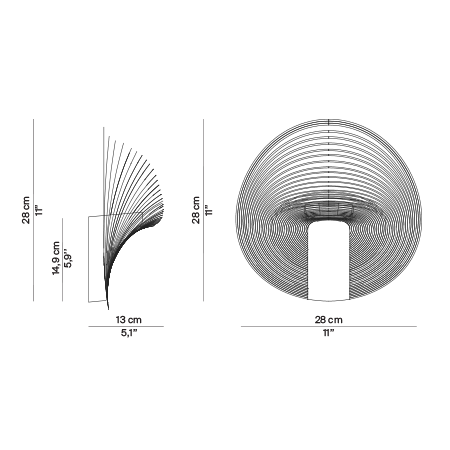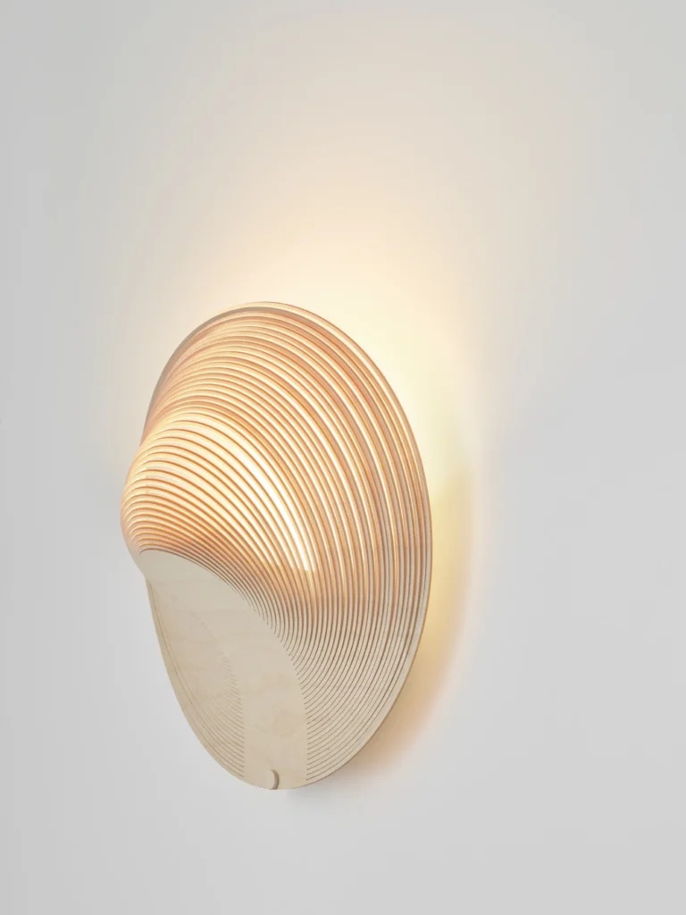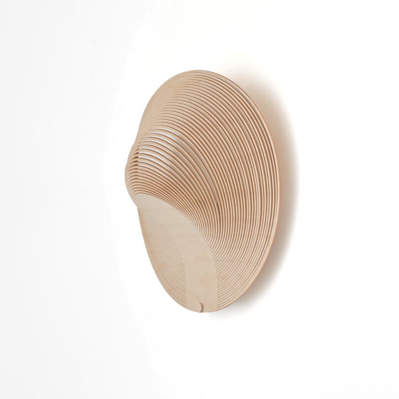 Элемент из литого алюминия c LED-капсулой, крепящийся к стене, направляет вверх теплый свет, который рассеивается плафоном диаметром всего 31см из тонкослоистой гибкой березовой древесины. Для его производства использован метод лазерной резки, а если точнее, метод экологичной переработки материала. Другими словами, настенный абажур — «побочный продукт» производства потолочных светильников Illan: остатки тонкофанерной нарезки, сложенные в форму настенной ракушки-бра, стали закономерным и прекрасным продолжением подвесной коллекции Illan.